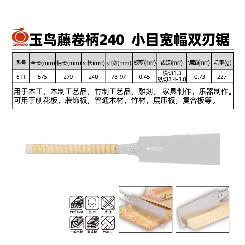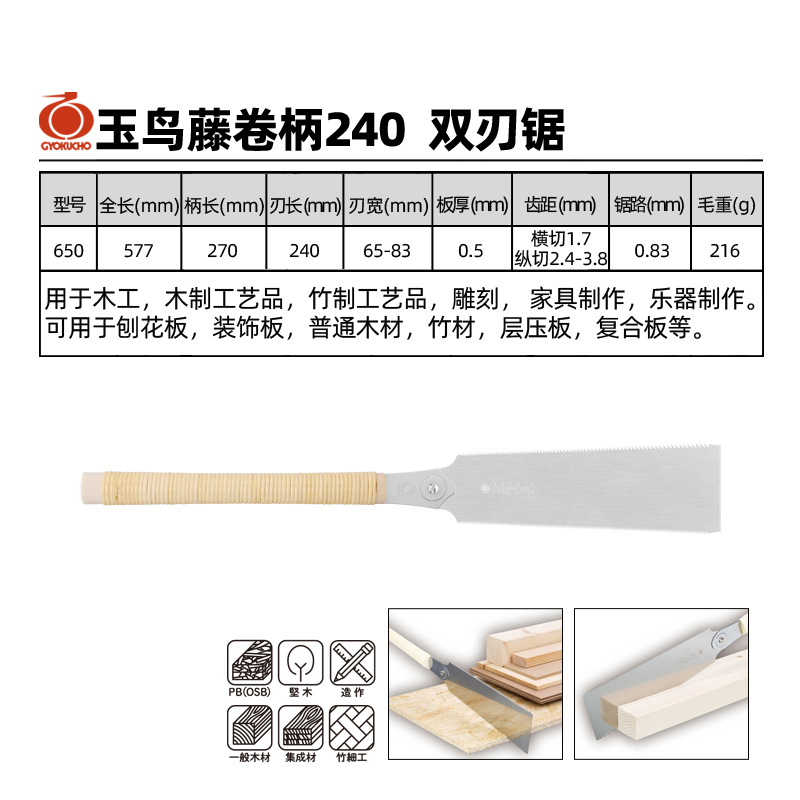 일본 옥새 등나무 롤 핸들 양날 톱, 양날 목공 톱, 가로 절단 및 세로 절단 이중 목적 수제 톱 목공 도구