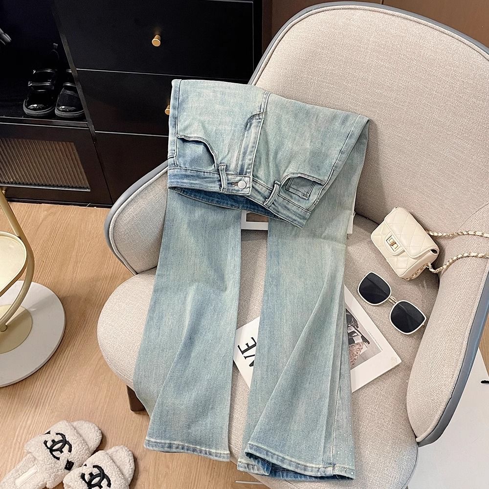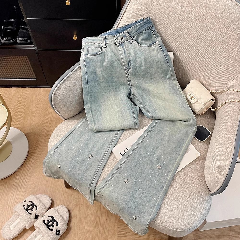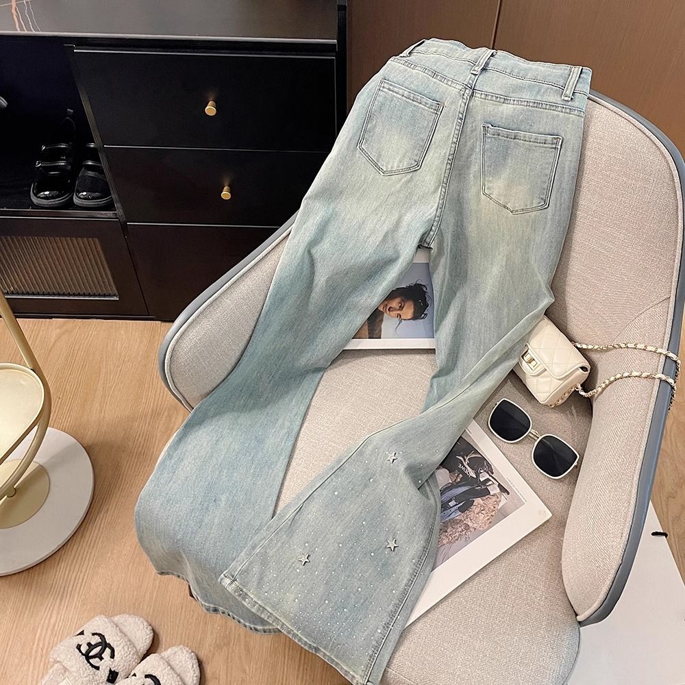 여성을위한 라이트 블루 핫 다이아몬드 마이크로 플레어 청바지 2025 여름 새로운 하이 웨이스트 슬림 탄성 슬리밍 말굽 바지스토어 가기