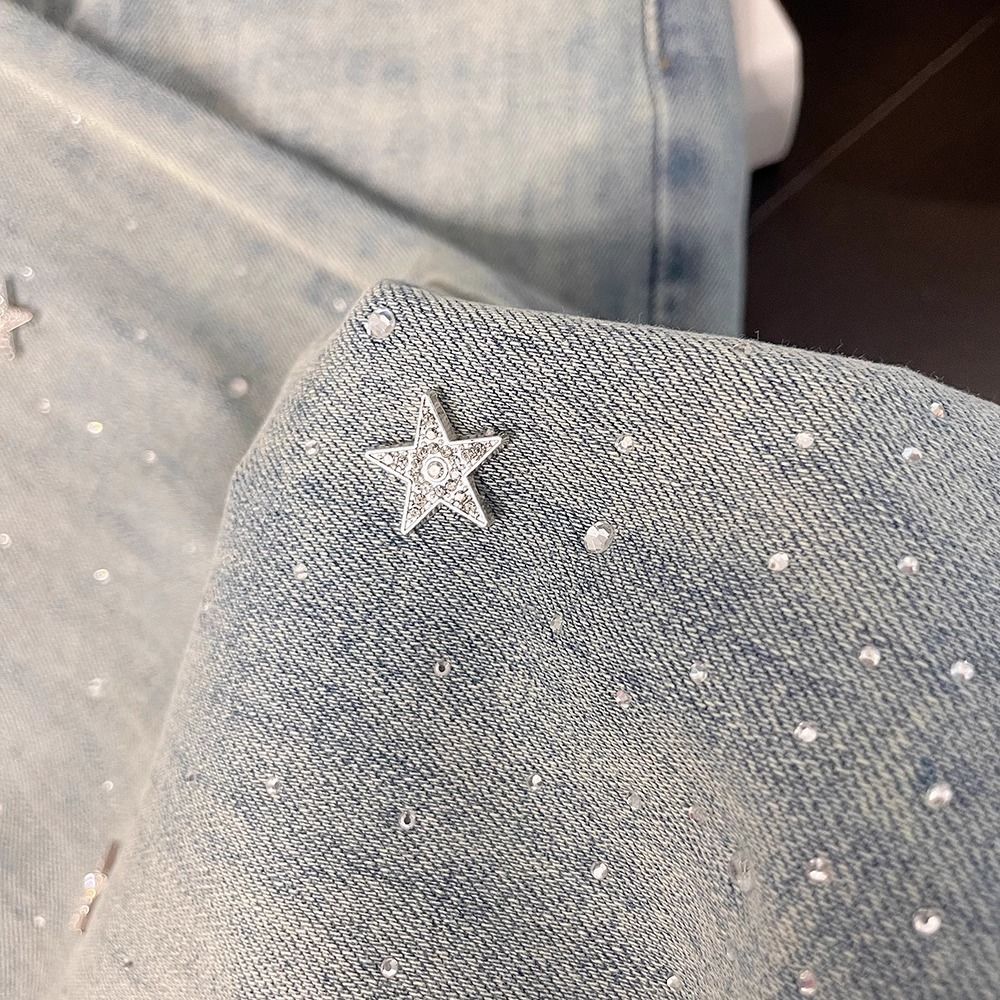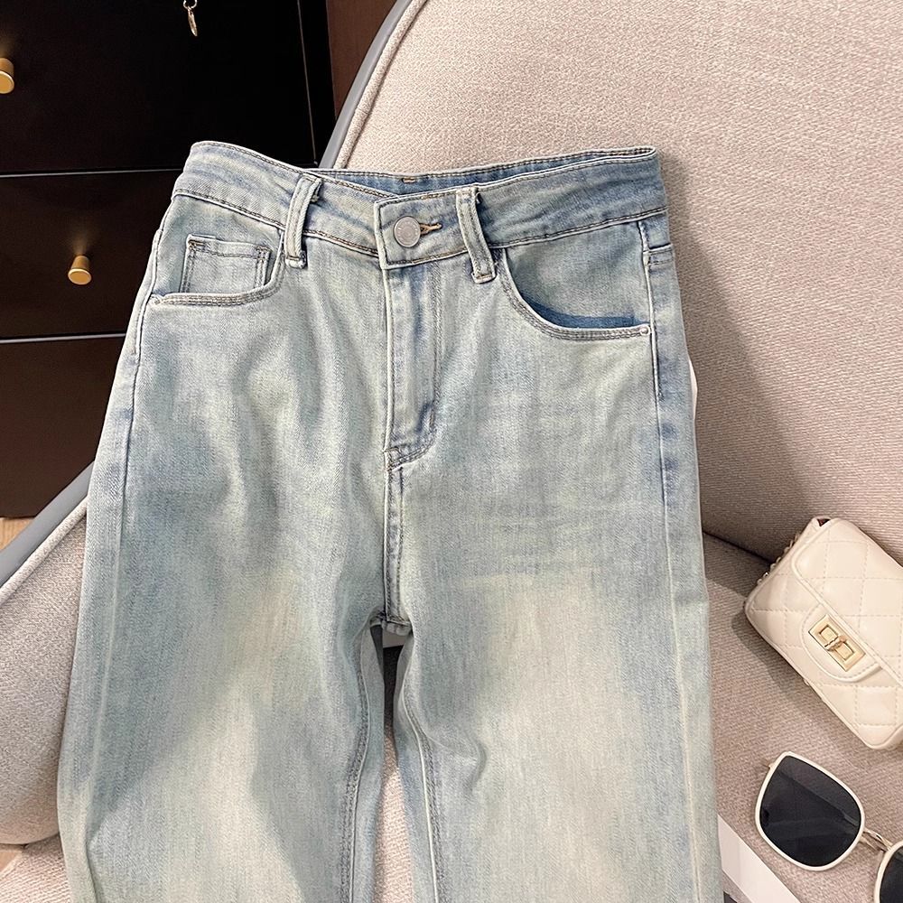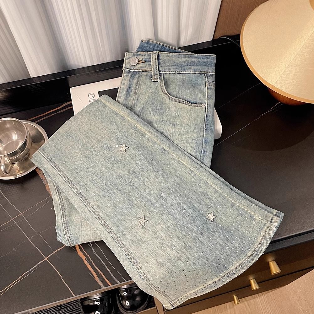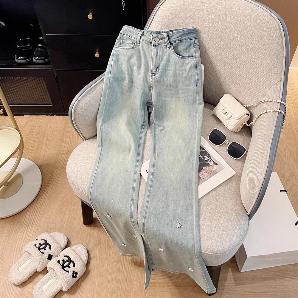 여성을위한 라이트 블루 핫 다이아몬드 마이크로 플레어 청바지 2025 여름 새로운 하이 웨이스트 슬림 탄성 슬리밍 말굽 바지스토어 가기
