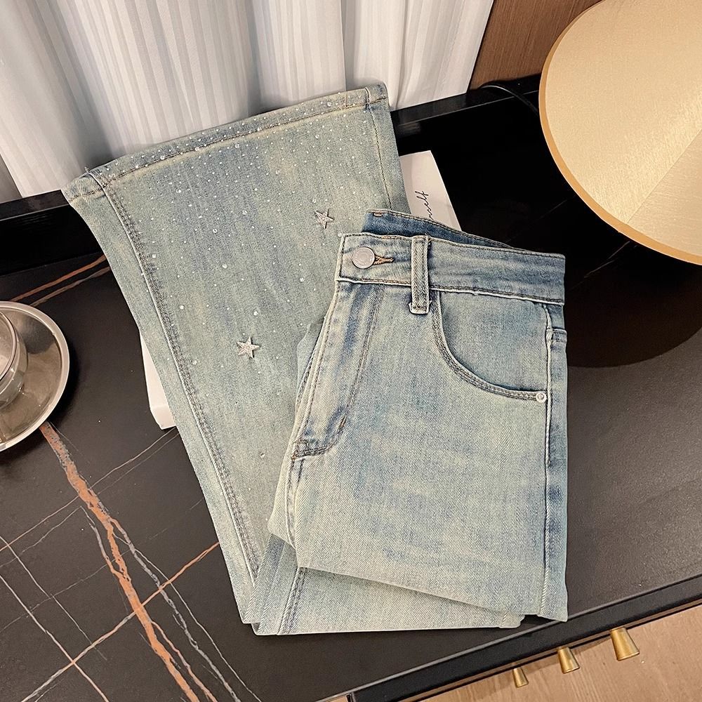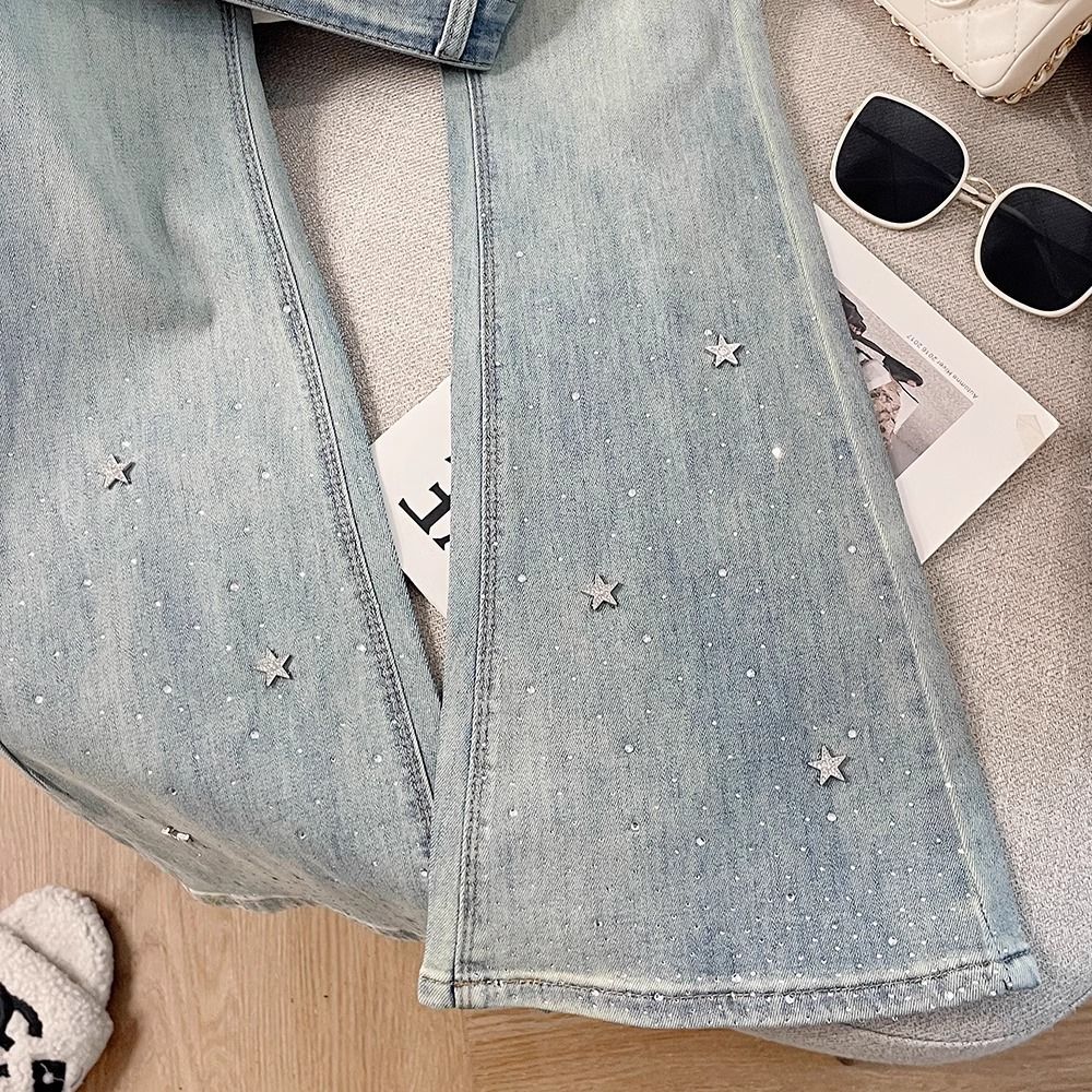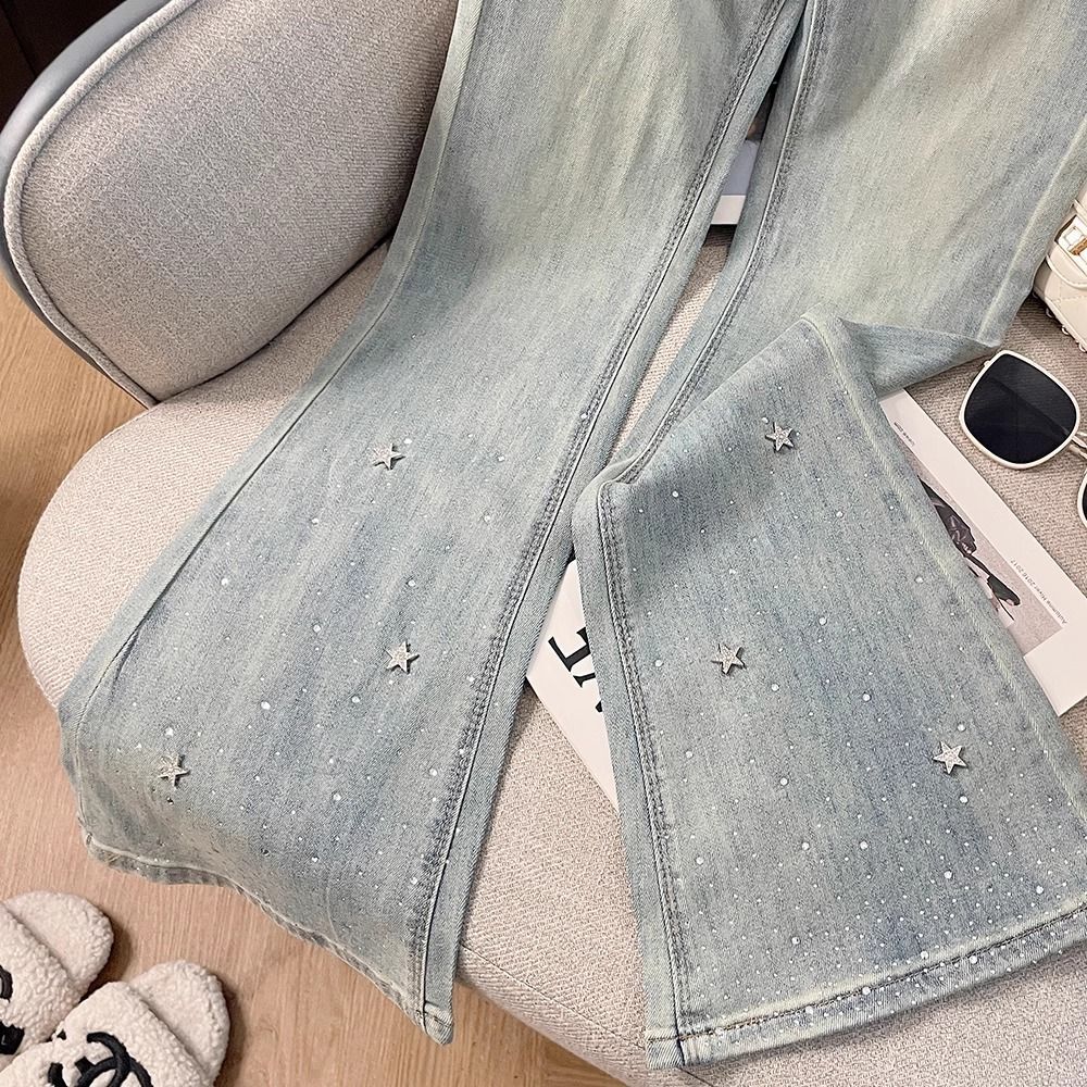 여성을위한 라이트 블루 핫 다이아몬드 마이크로 플레어 청바지 2025 여름 새로운 하이 웨이스트 슬림 탄성 슬리밍 말굽 바지