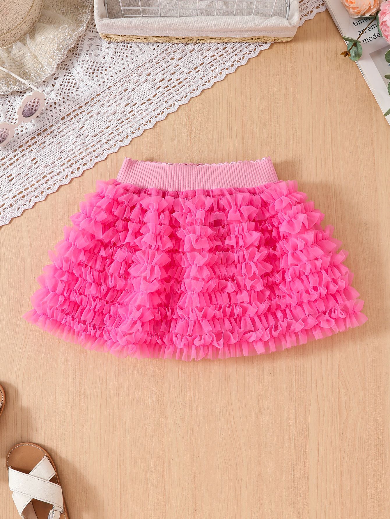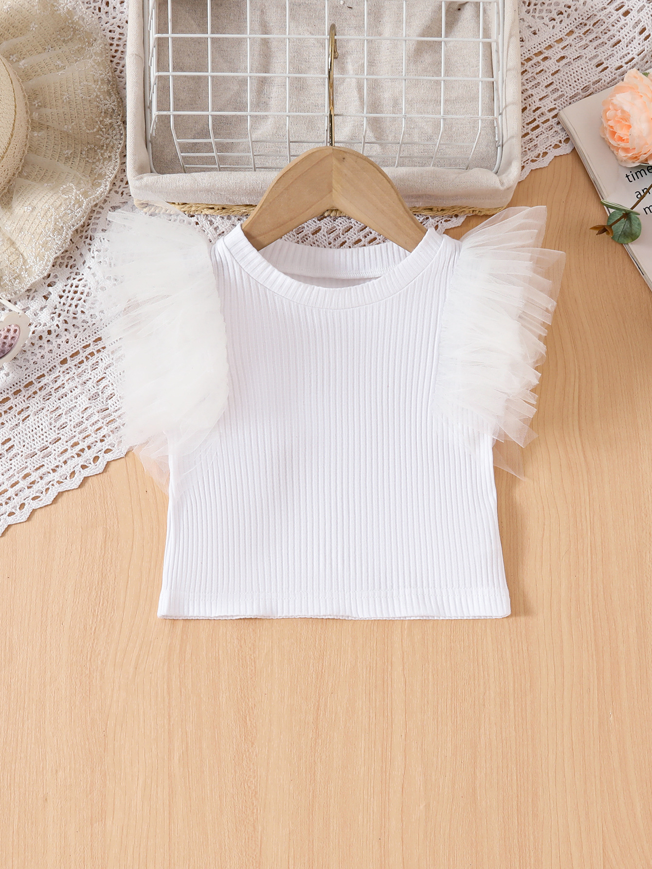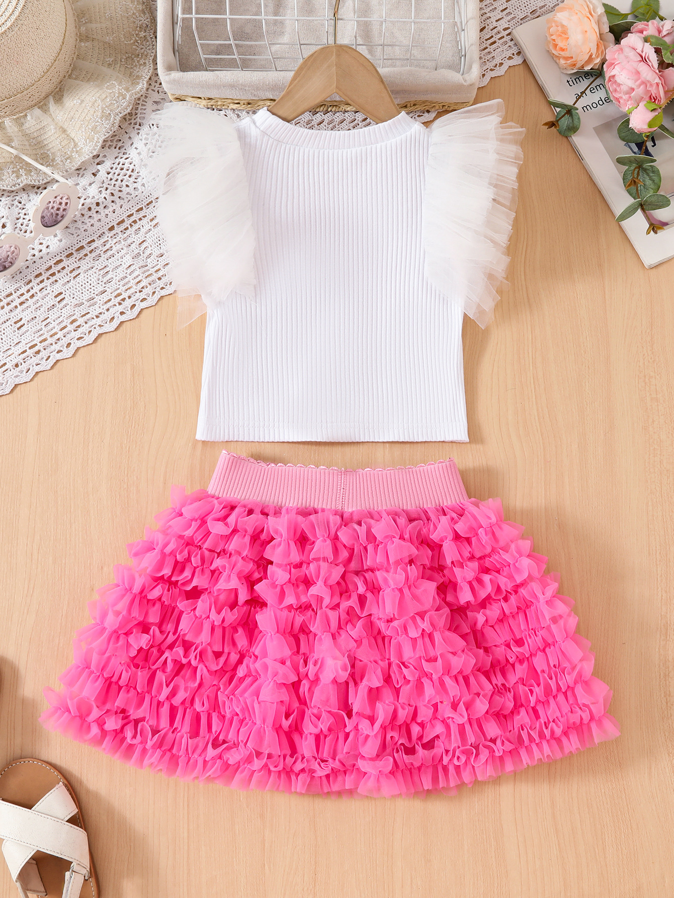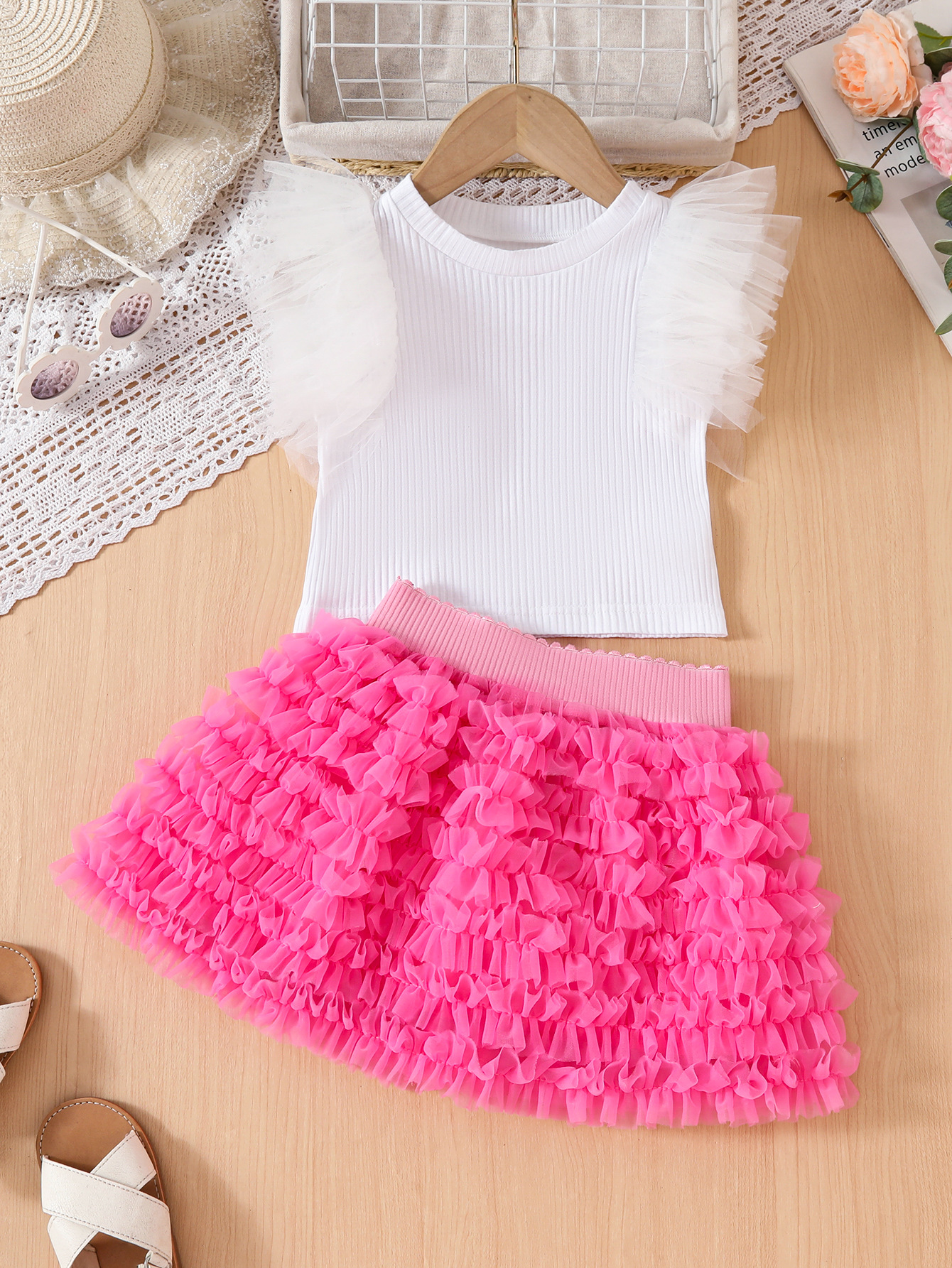 여자 짧은 치마 어린이 치마 봄과 가을 한국 스타일 공주 원사 스커트 메쉬 플라잉 슬리브 탑 여름 서양식 스커트 세트
