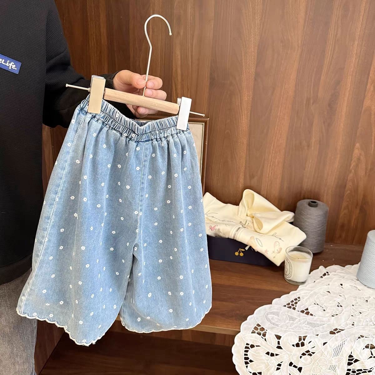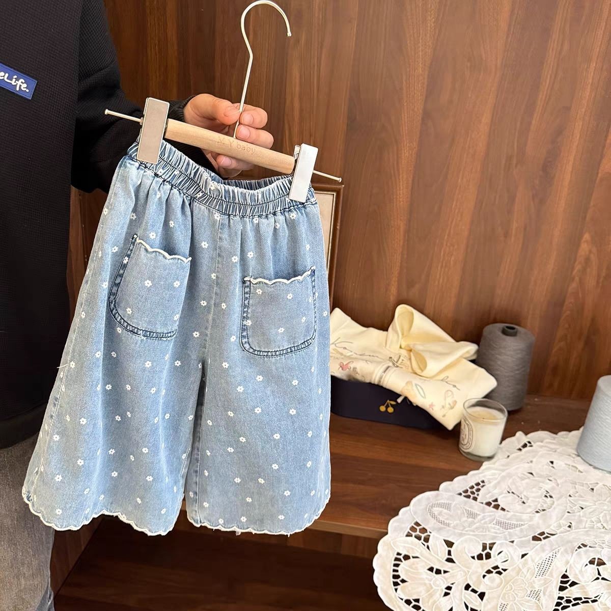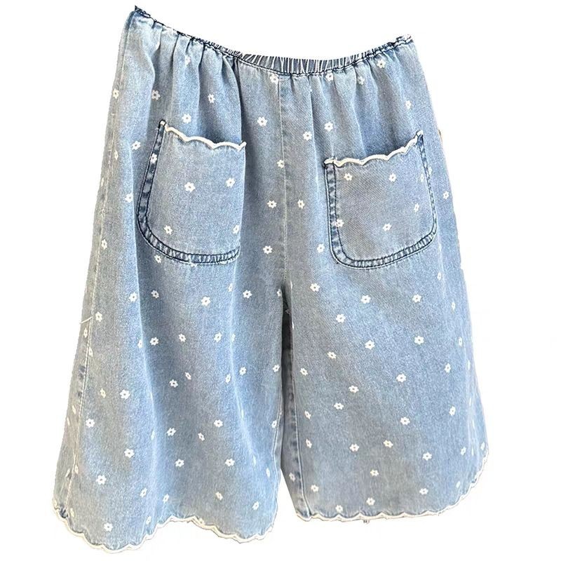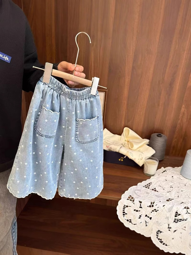 아기 소녀 슈퍼 부드러운 얇은 인쇄 청바지 아기 소녀 여름 2025 새로운 여자 느슨한 9 점 와이드 레그 바지스토어 가기