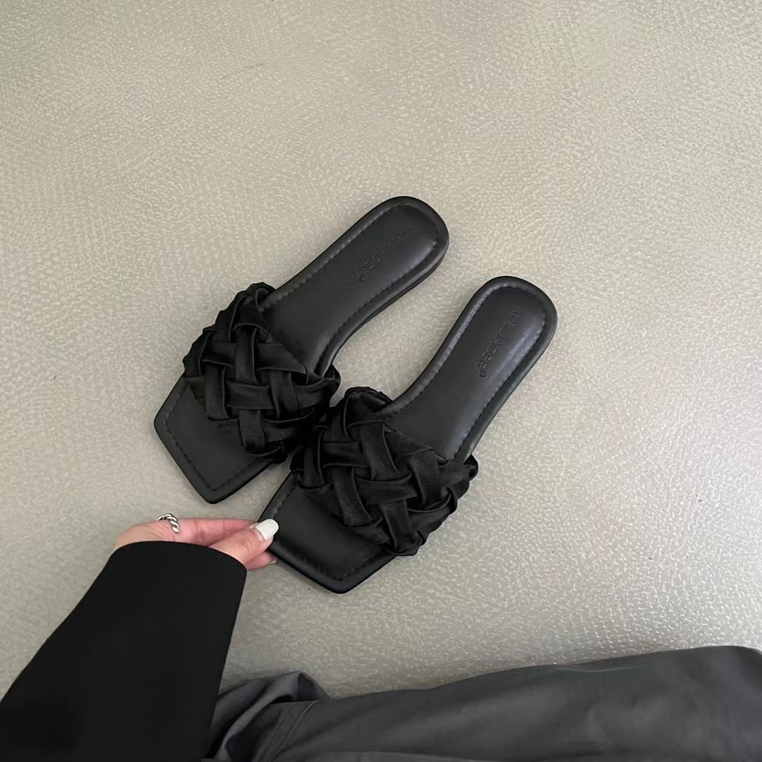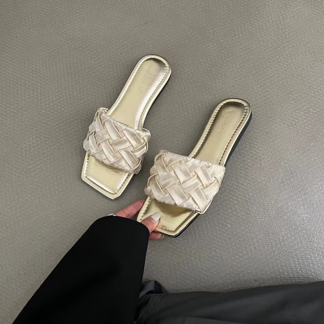 여성을위한 평면 프랑스 실크 새틴 스퀘어 발가락 샌들 2025 새로운 스타일 여름 우아한 짠 샌들