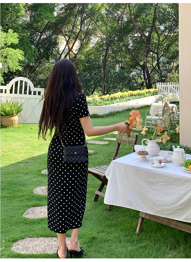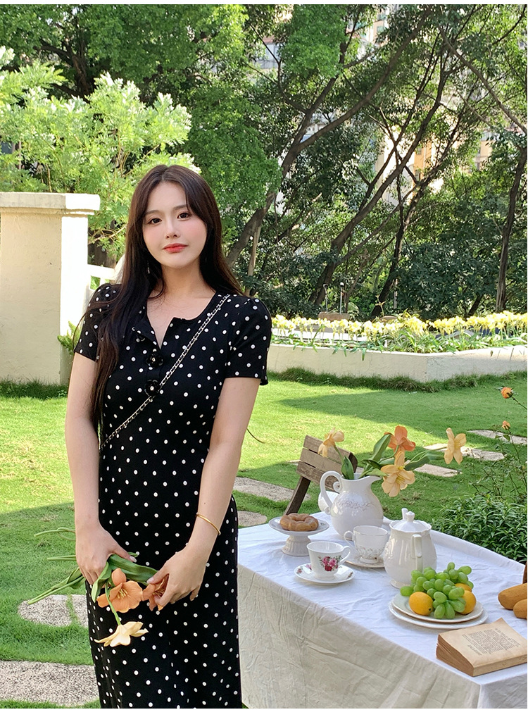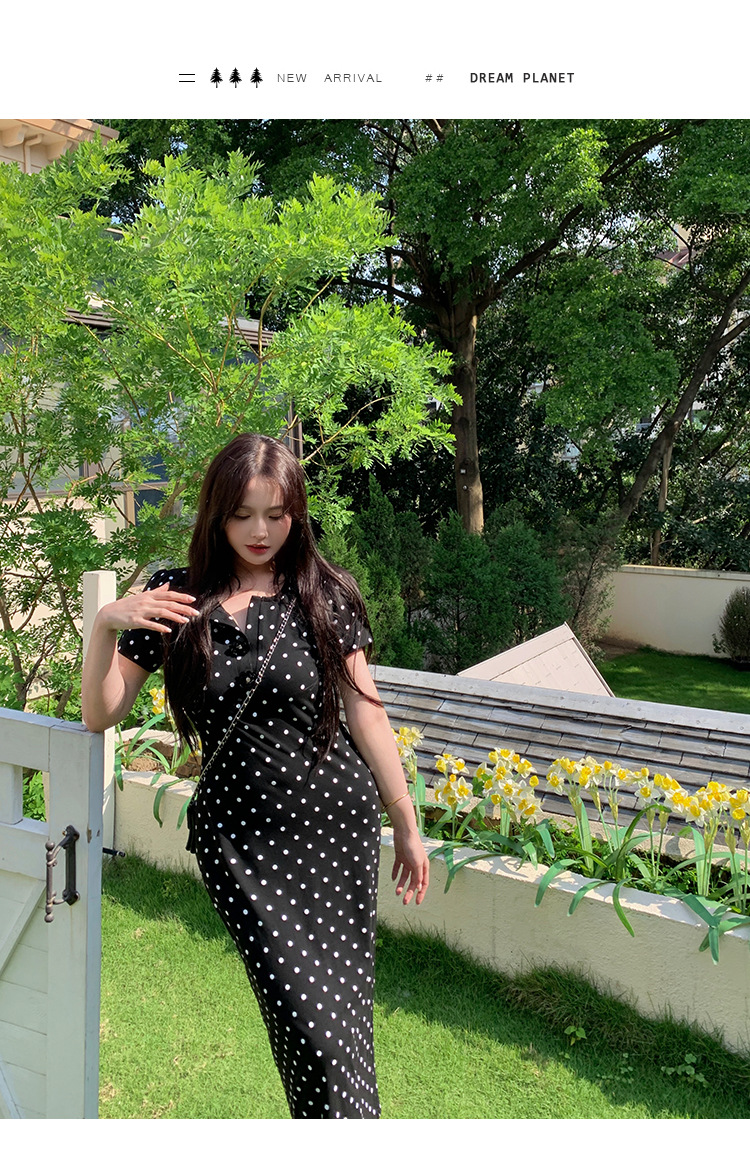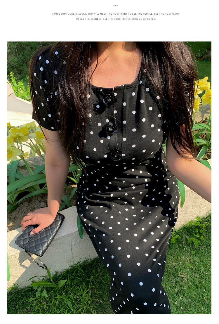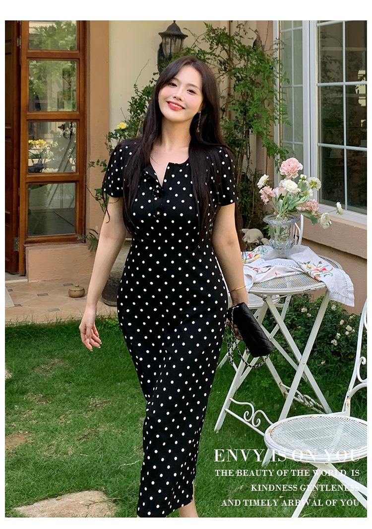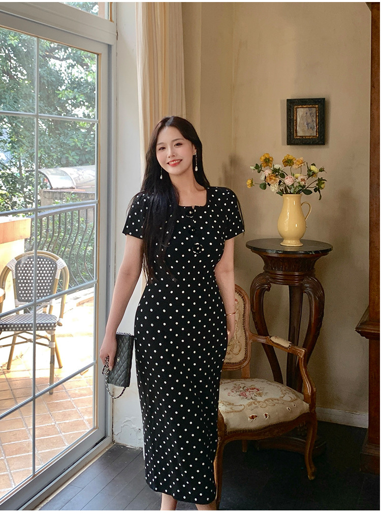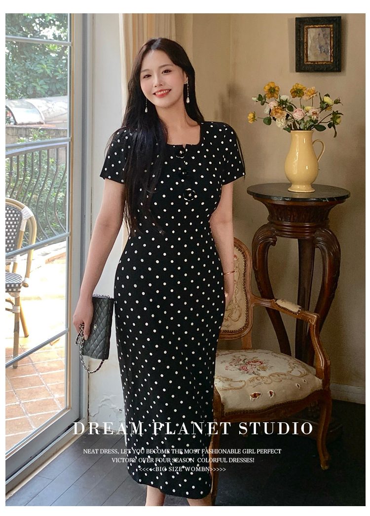 플러스 사이즈 여성 하이 엔드 프랑스 패션 섹시한 웨이브 포인트 엉덩이 원피스 통통녀 스퀘어 넥 슬림 핏 롱 2089