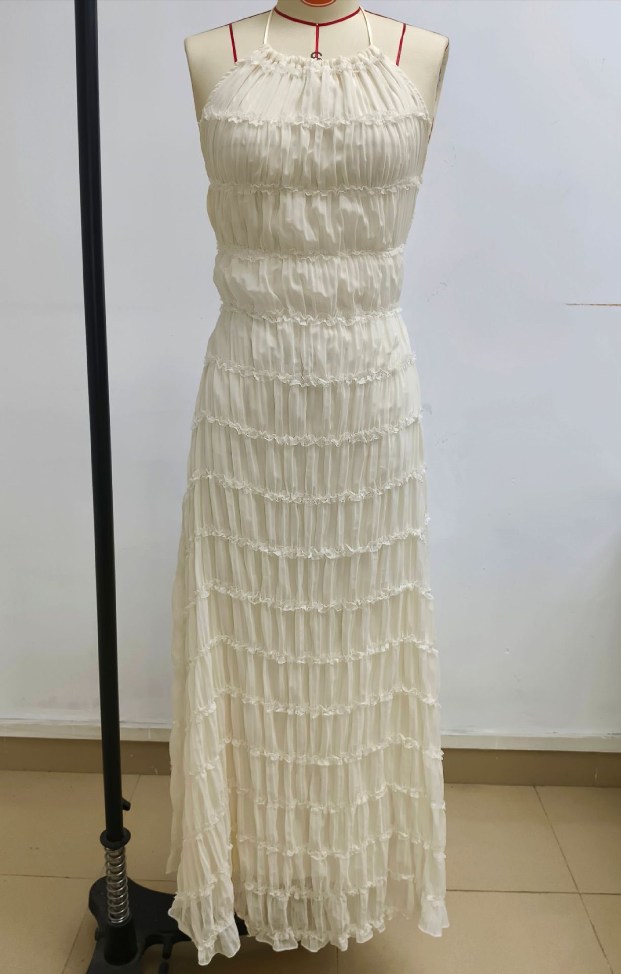 유럽과 미국의 대외 무역 여성의 등이없는 주름 직물 독특한 원피스 새로운 통기성 레이스 업 연꽃 잎 원피스스토어 가기