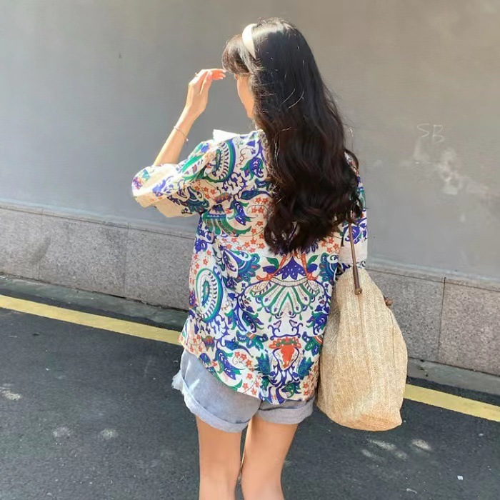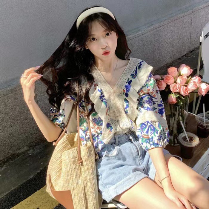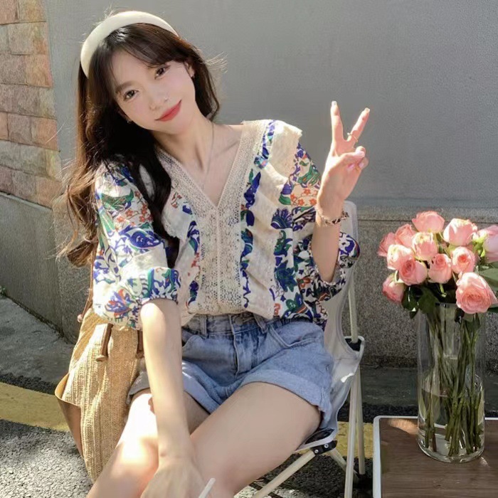 레이스 바느질 V-넥 꽃 반팔 셔츠 여성 디자인 틈새 2025 여름 새로운 프랑스 탑스토어 가기