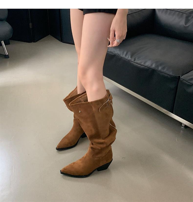 재고 있음~핫걸 빅튜브 플리츠 스택부츠 여성 2024 가을 하이부츠 두꺼운 굽 웨스턴부츠 롱부츠스토어 가기