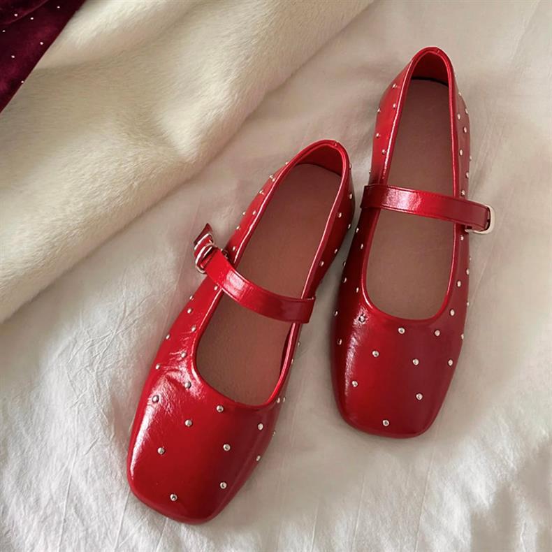재고 있음 ~ 리벳 레드 메리 제인 여성 2025 봄 스퀘어 토 펌프스 플랫 플랫 스트랩 작은 가죽 신발