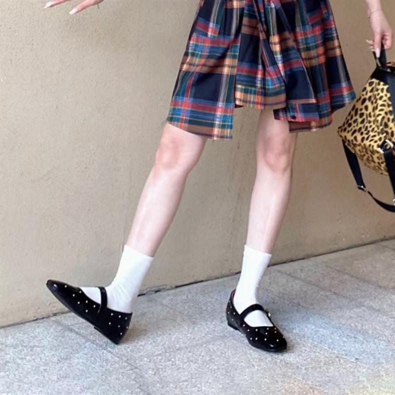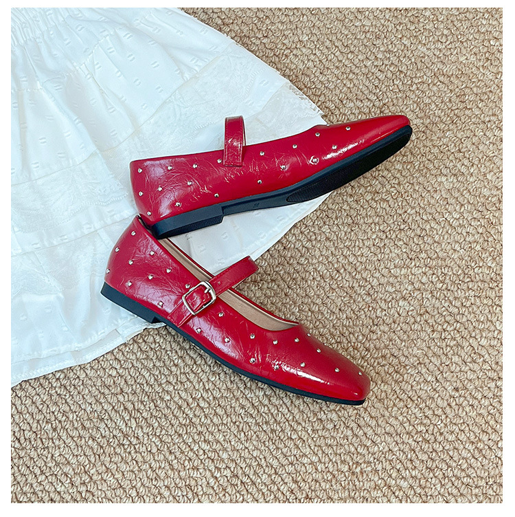 재고 있음 ~ 리벳 레드 메리 제인 여성 2025 봄 스퀘어 토 펌프스 플랫 플랫 스트랩 작은 가죽 신발스토어 가기