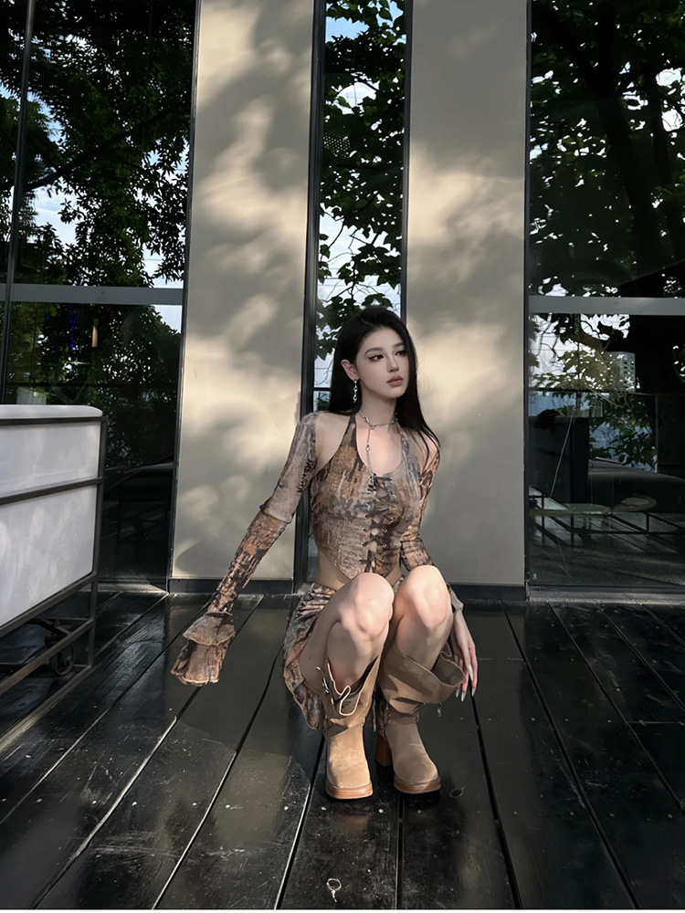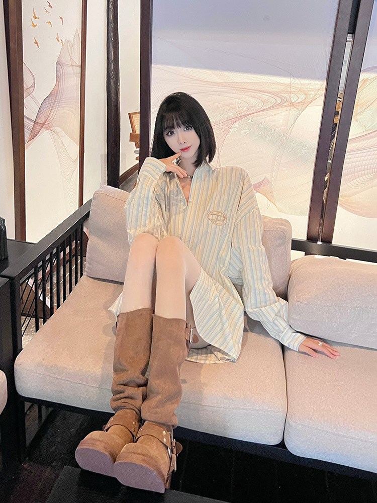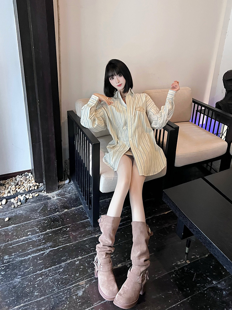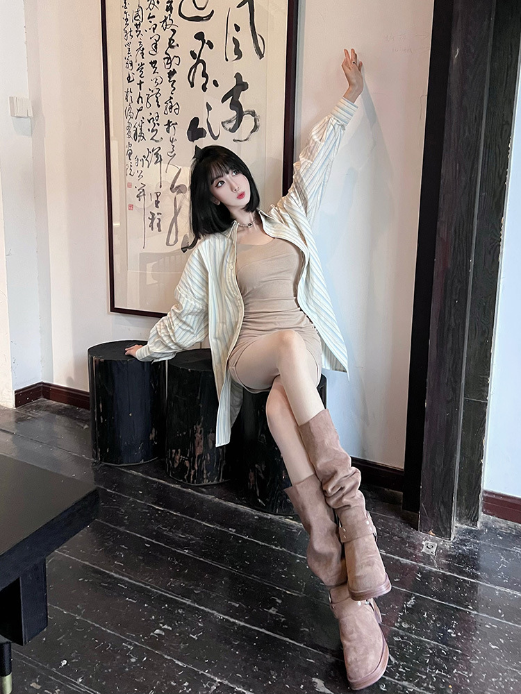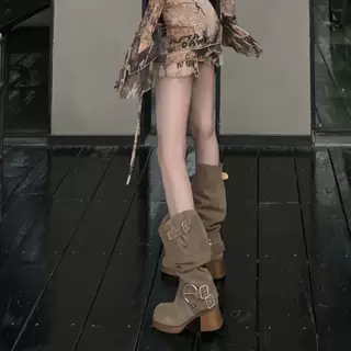 여성용 대형 튜브 스웨이드 플리츠 페이스트 부츠 2025 봄 여름 메탈 버클 웨스턴 부츠 두꺼운 굽 롱부츠 나이트 부츠스토어 가기