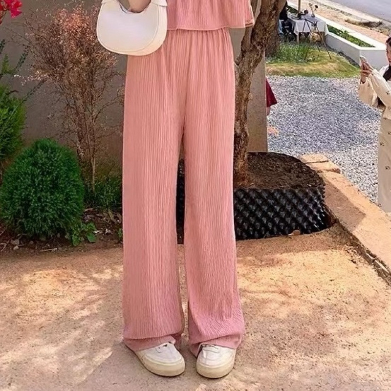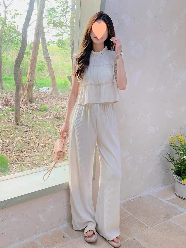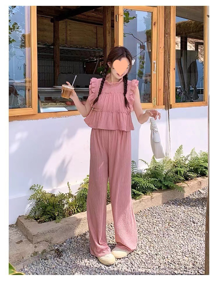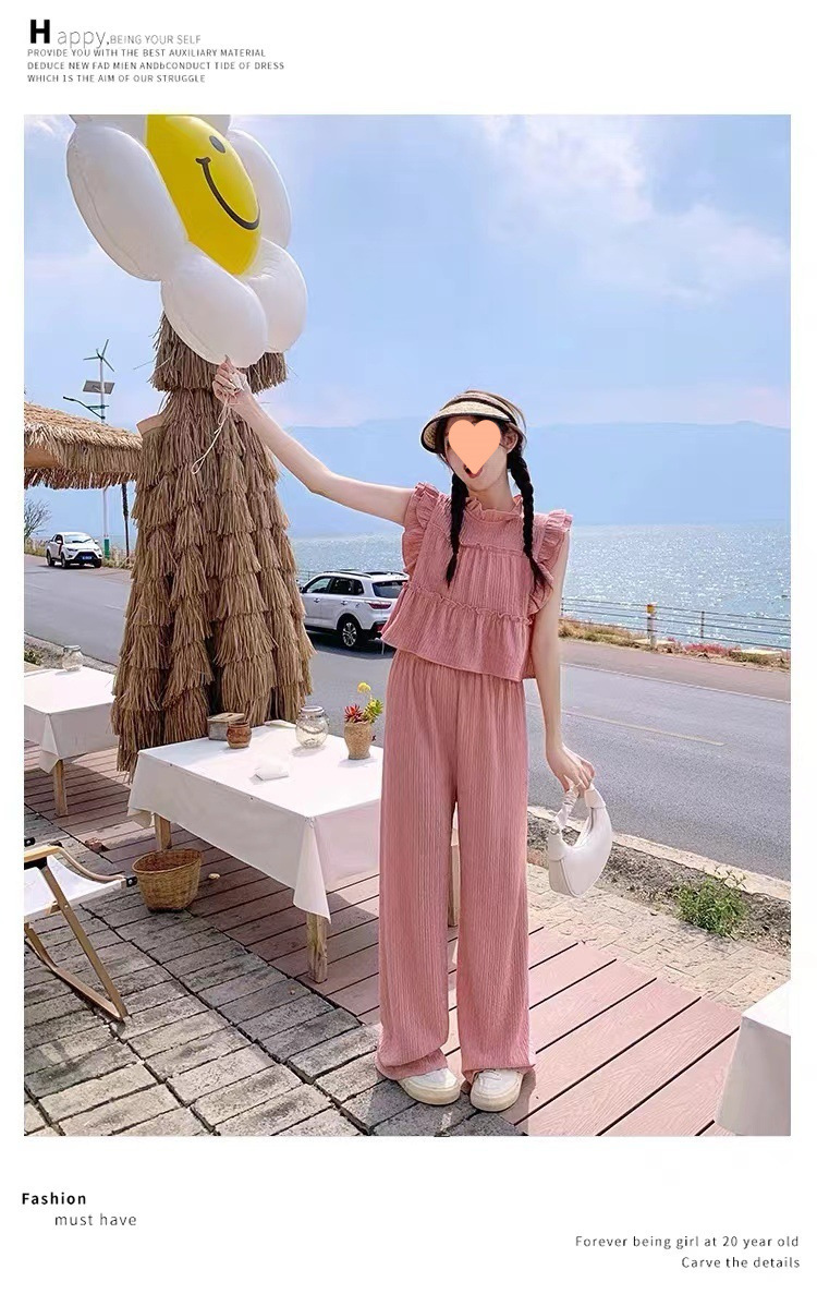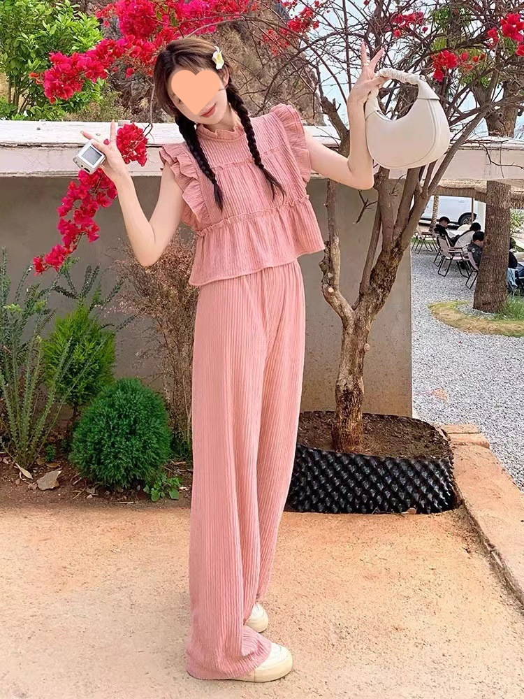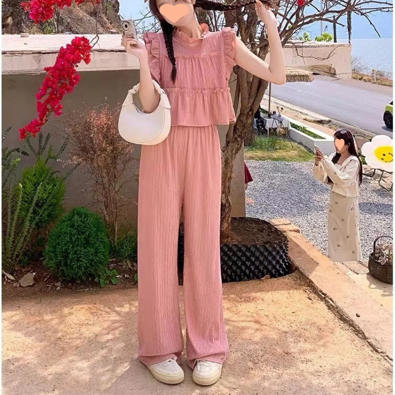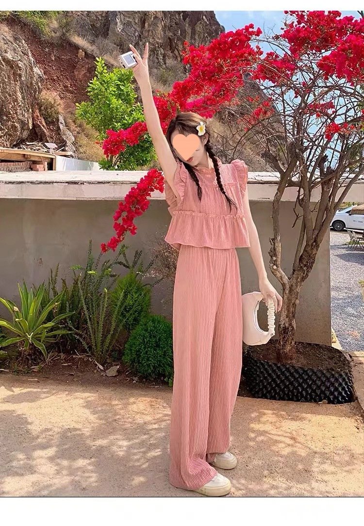 패션 세트 여성 여름 새로운 2024 민소매 캐주얼 탑 루즈 와이드 레그 팬츠 바지 투피스 세트