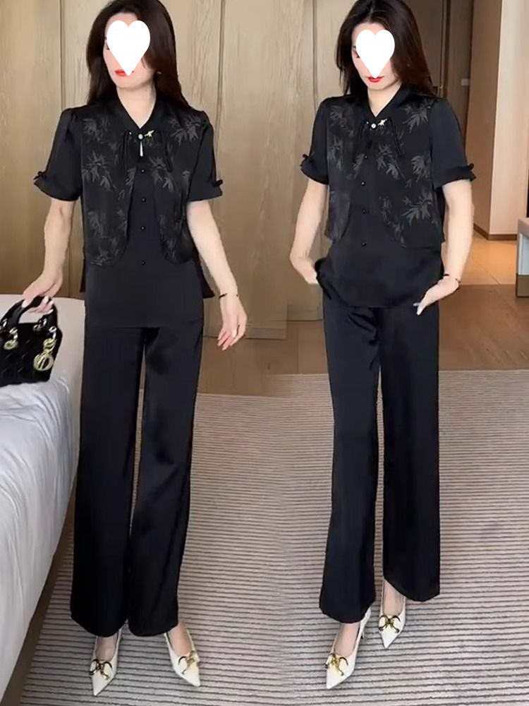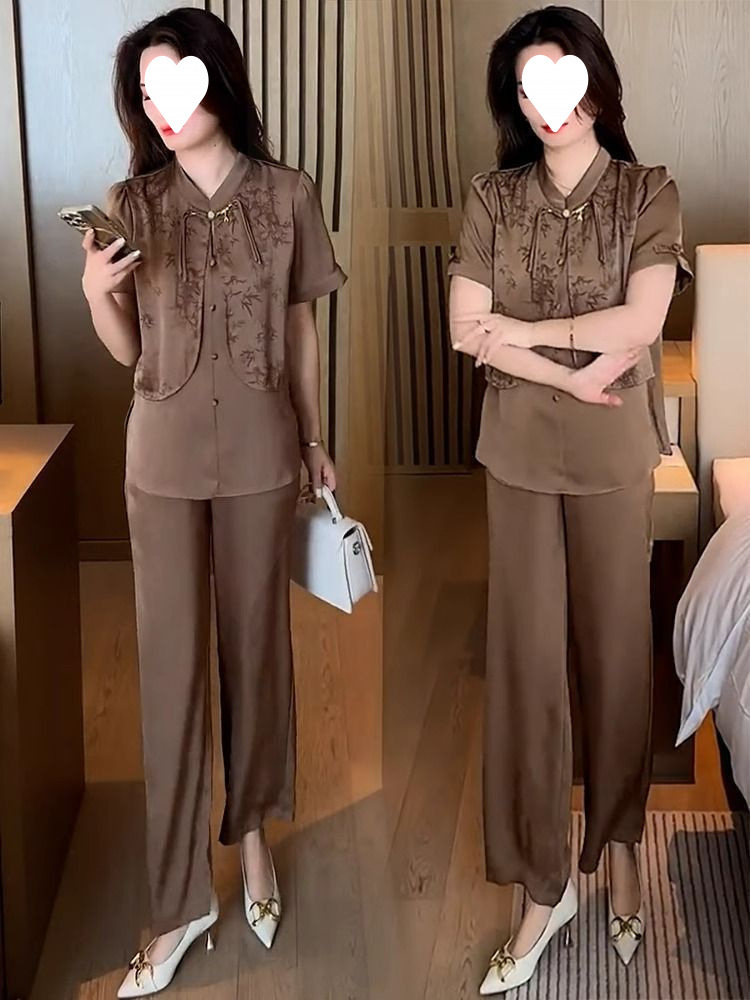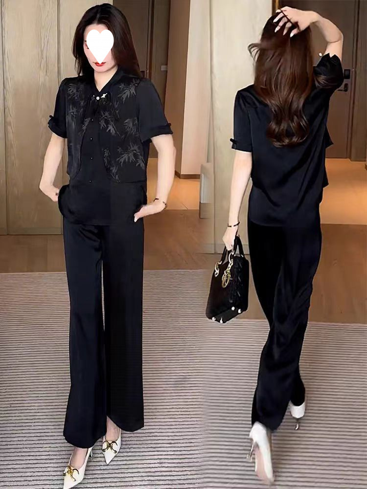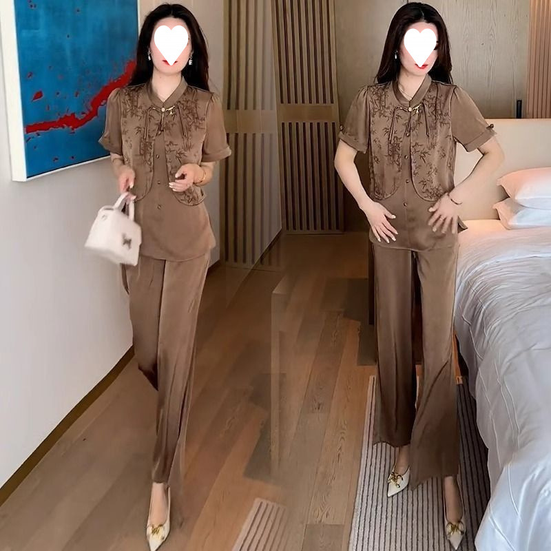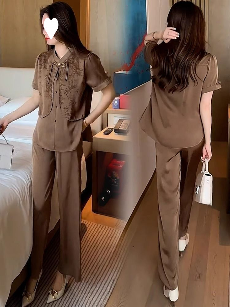여성을위한 새로운 중국 스타일 패션 정장 2024 여름 새로운 기질 슬림 인쇄 반팔 셔츠 와이드 레그 바지 투피스 세트