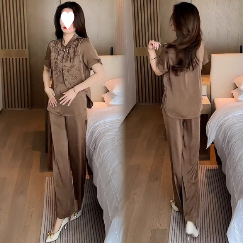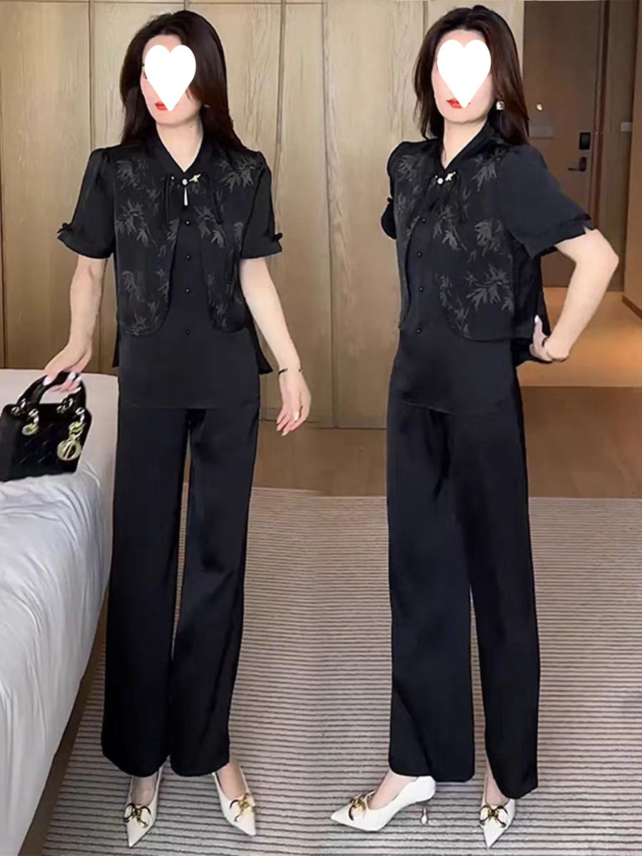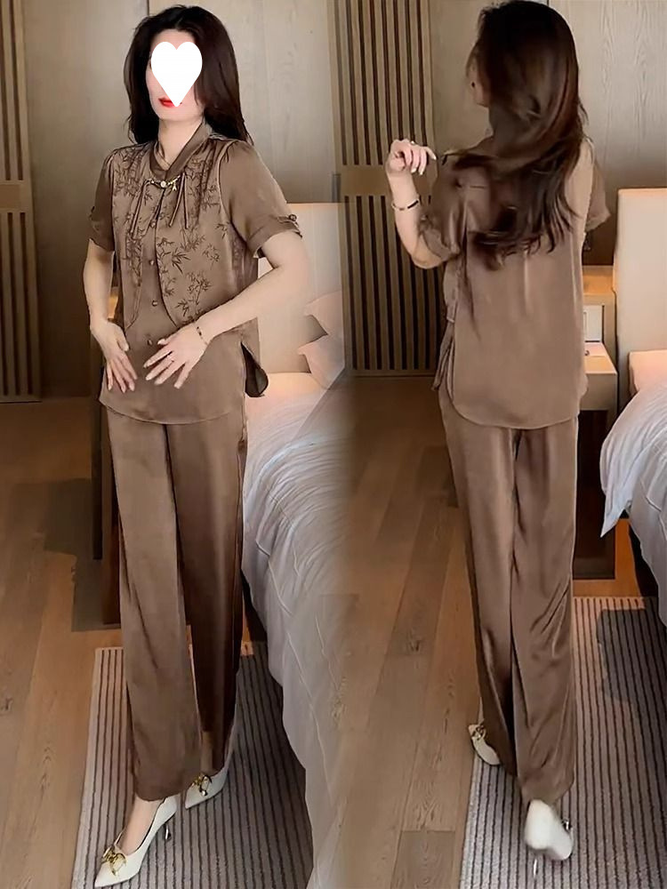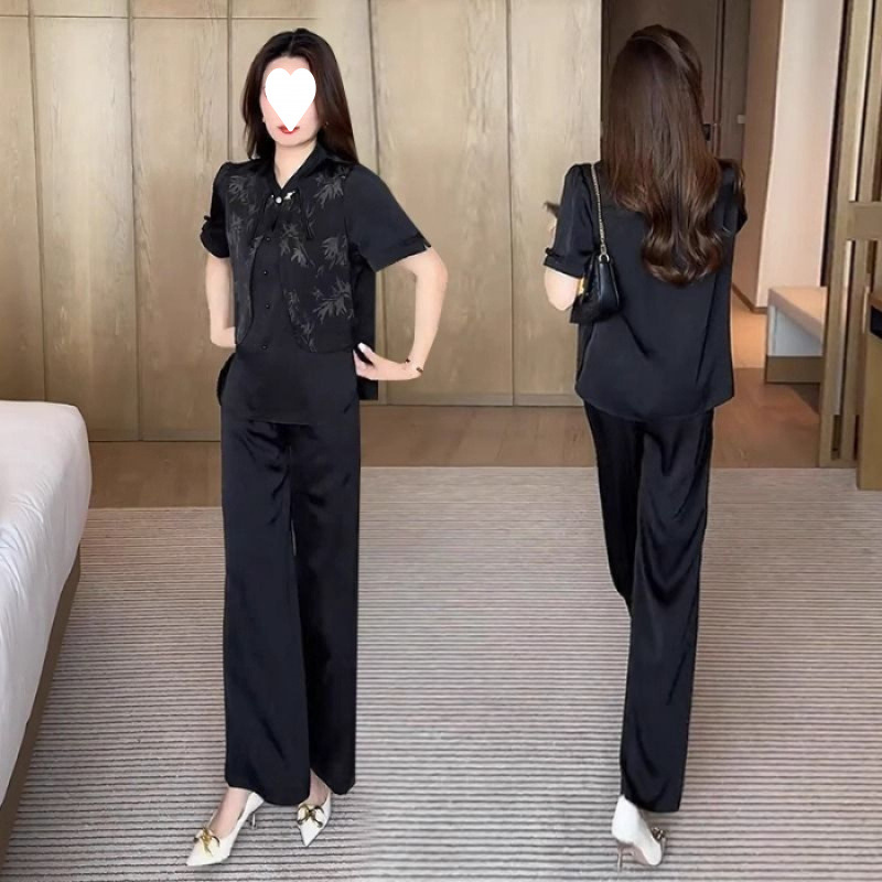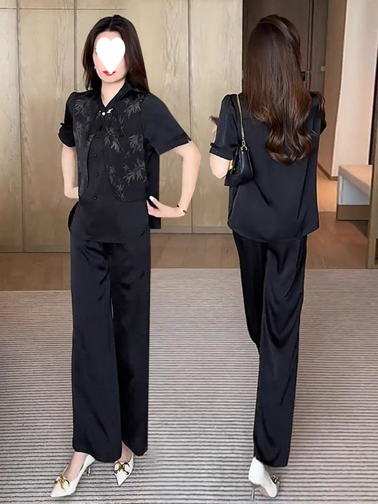 여성을위한 새로운 중국 스타일 패션 정장 2024 여름 새로운 기질 슬림 인쇄 반팔 셔츠 와이드 레그 바지 투피스 세트스토어 가기