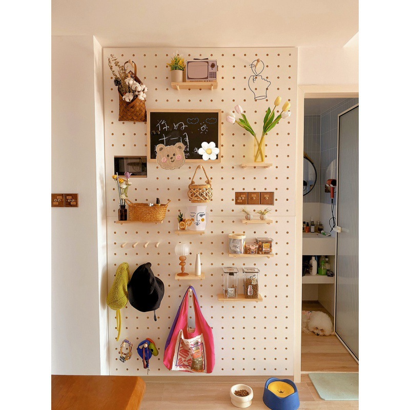 단단한 나무 구멍 보드 상부 벽 저장 랙 저장 선반 침실 거실 입구 파티션 전기 미터 상자 배경 벽스토어 가기