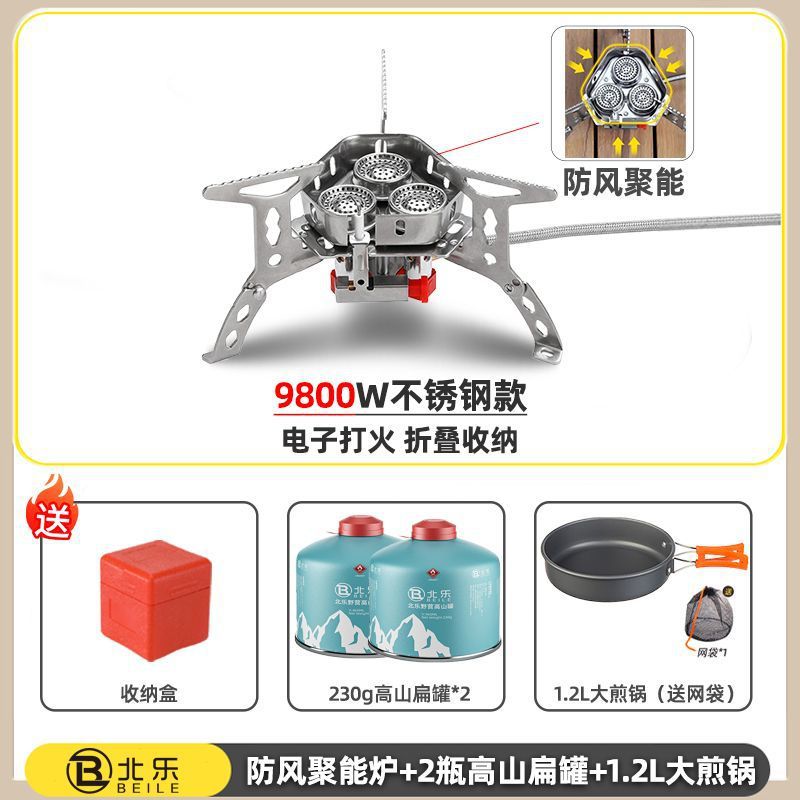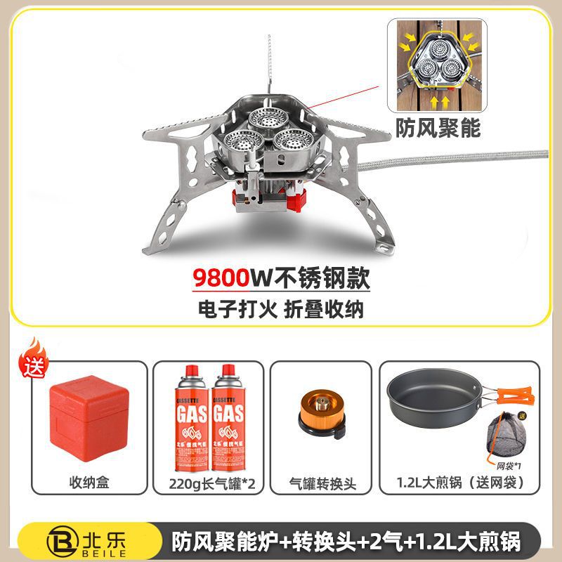 • ] 9800W 스틸버너 [물이 끓는 데 단 3분 소요 - [방풍 에너지 수집 스토브] + 변환 헤드 + 가스 2개 + 프라이팬 1.2개