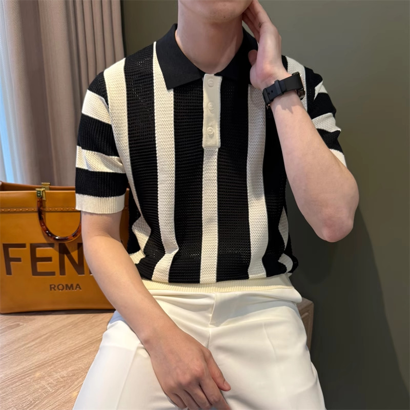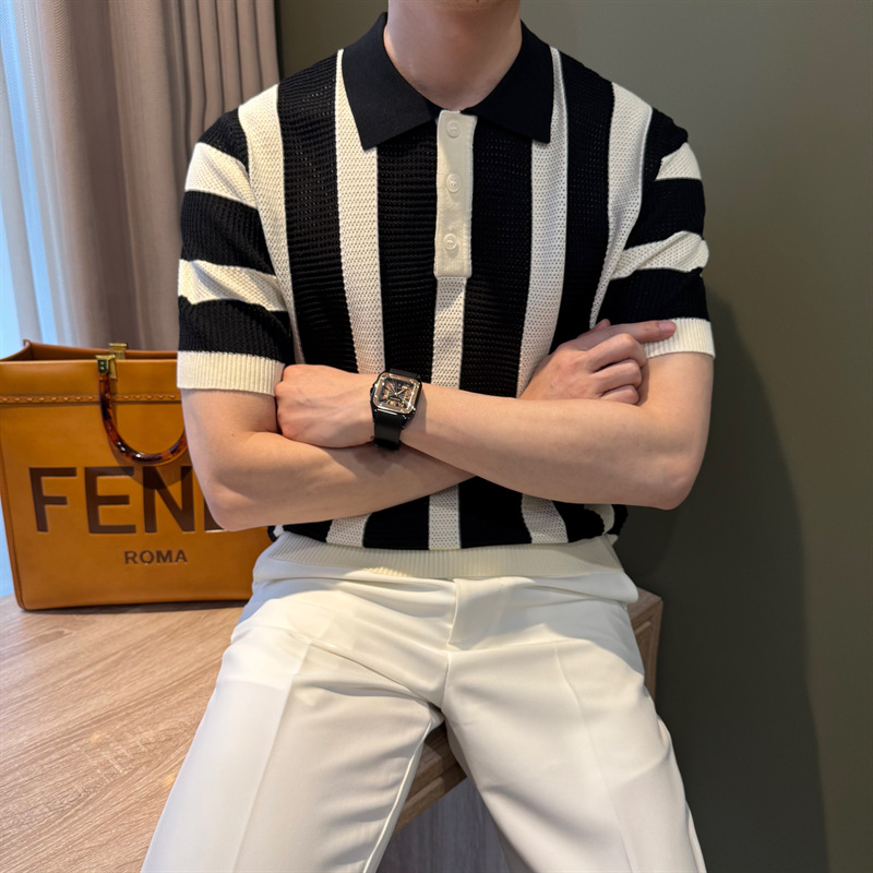 하이 엔드 라펠 남성용 니트 스트라이프 반팔 폴로 셔츠 고탄성 통기성 잘 생긴 트렌디 반팔 티셔츠 남성용 탑스토어 가기
