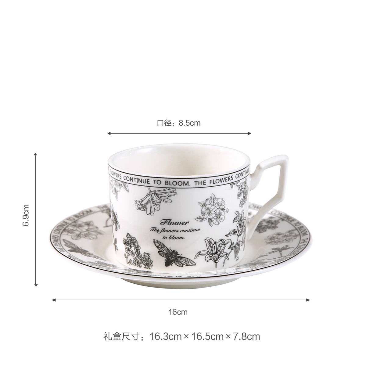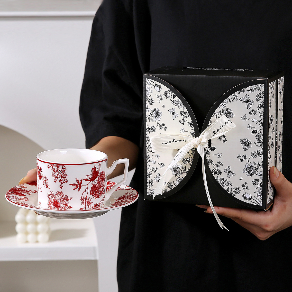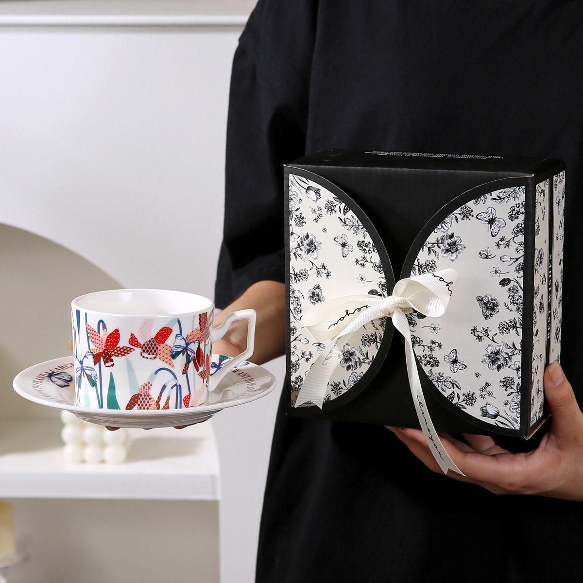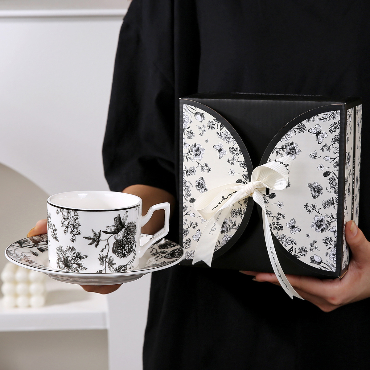 • 레트로 플라워 블랙 커피 컵과 접시