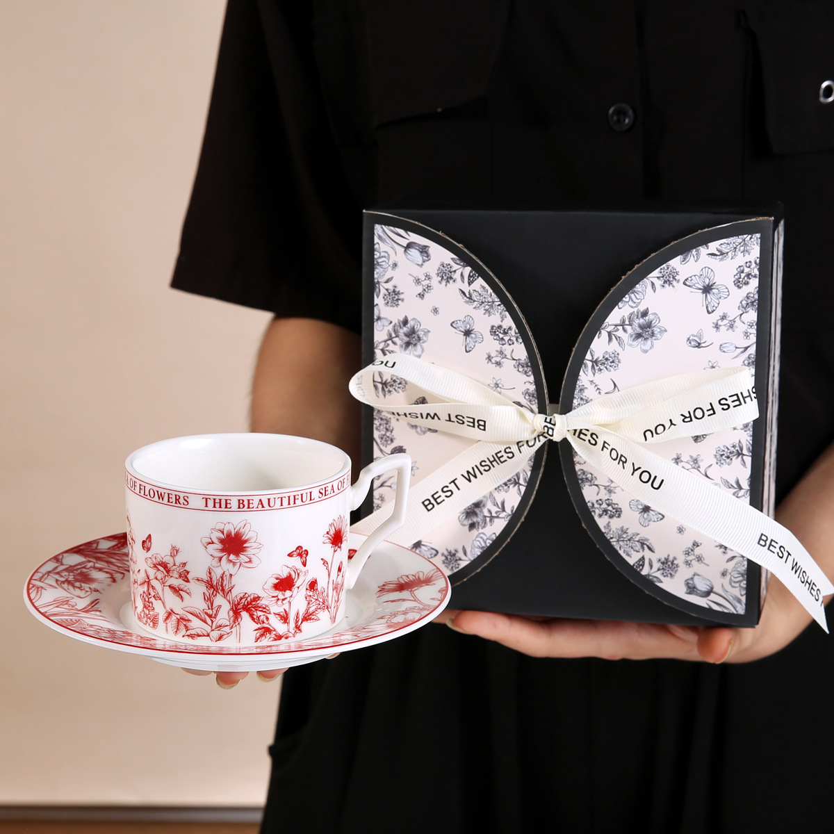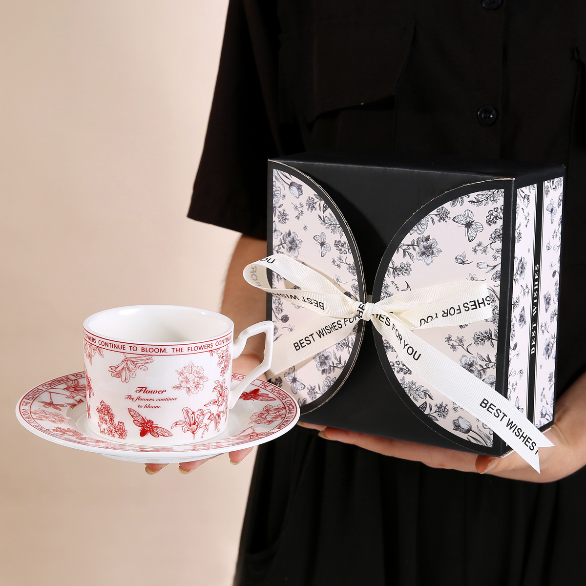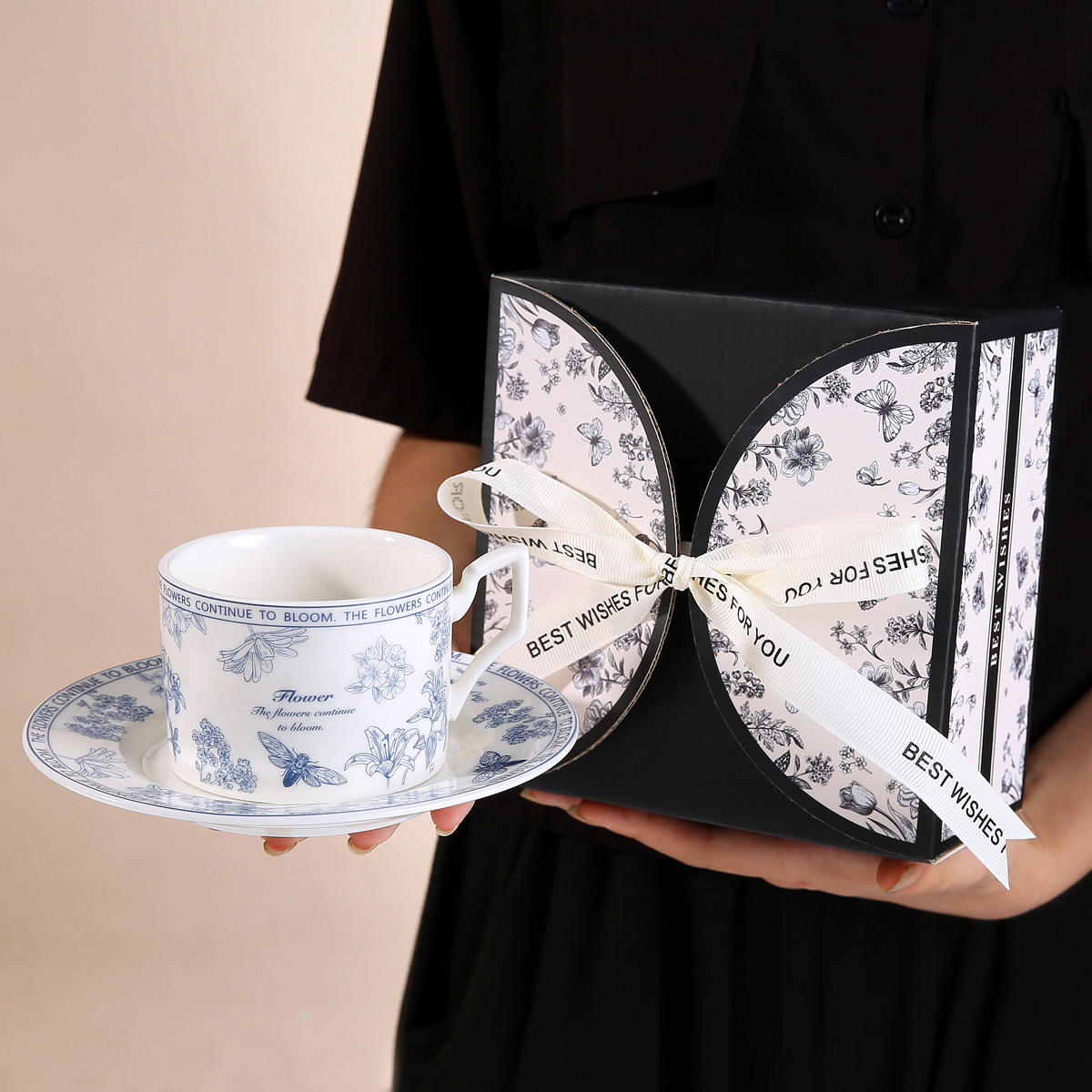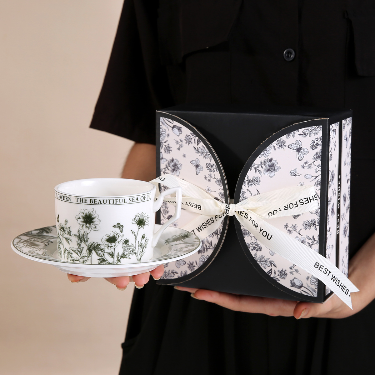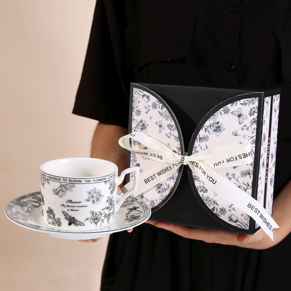 • 레트로 플라워 블랙 커피 컵과 접시