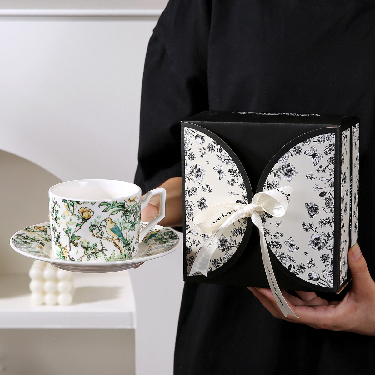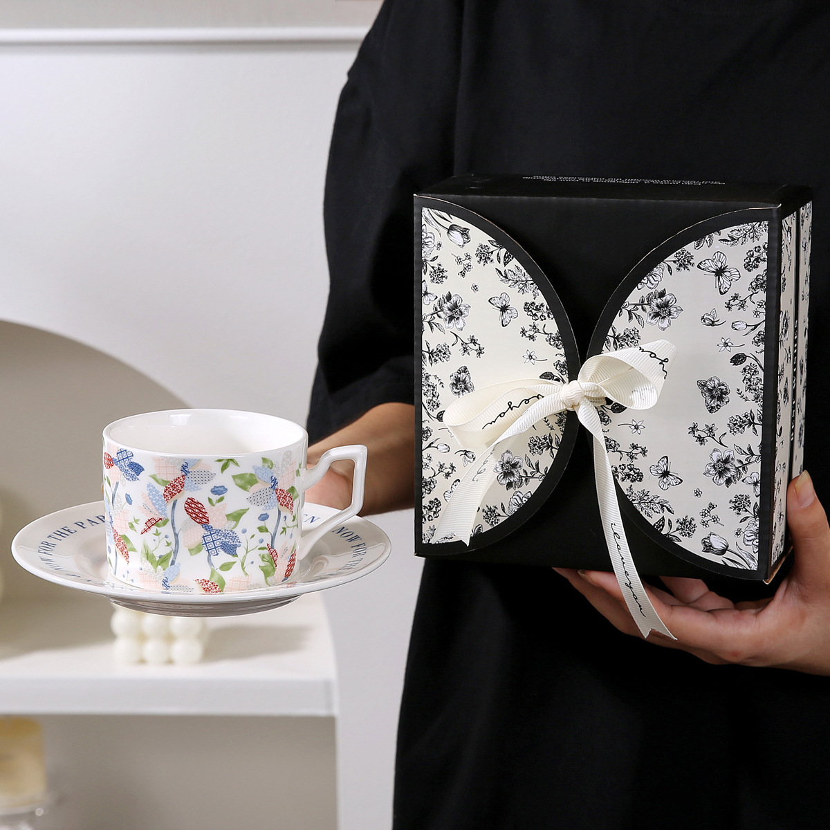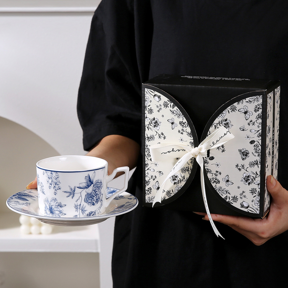 • 나비 블랙 커피 컵과 접시