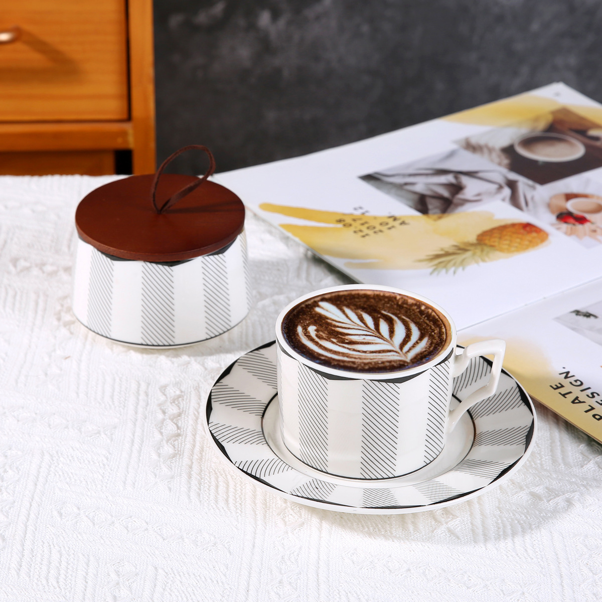 • 세련된 줄무늬 커피 컵과 접시