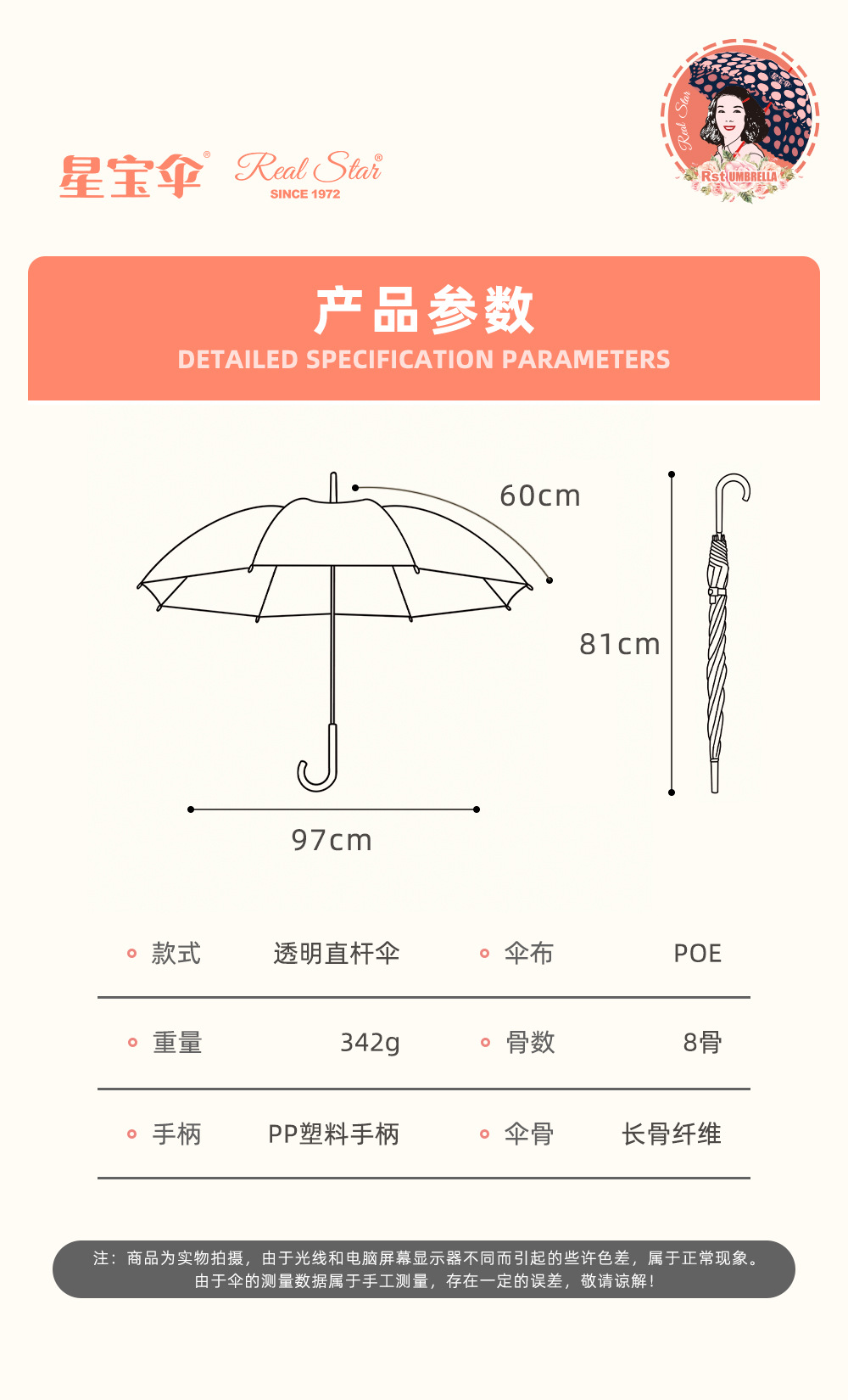 • 우산 표면의 곡선 크기는 약 121cm*우산 아래 직경은 약 97cm*1-2인에게 적합*열쇠 열림