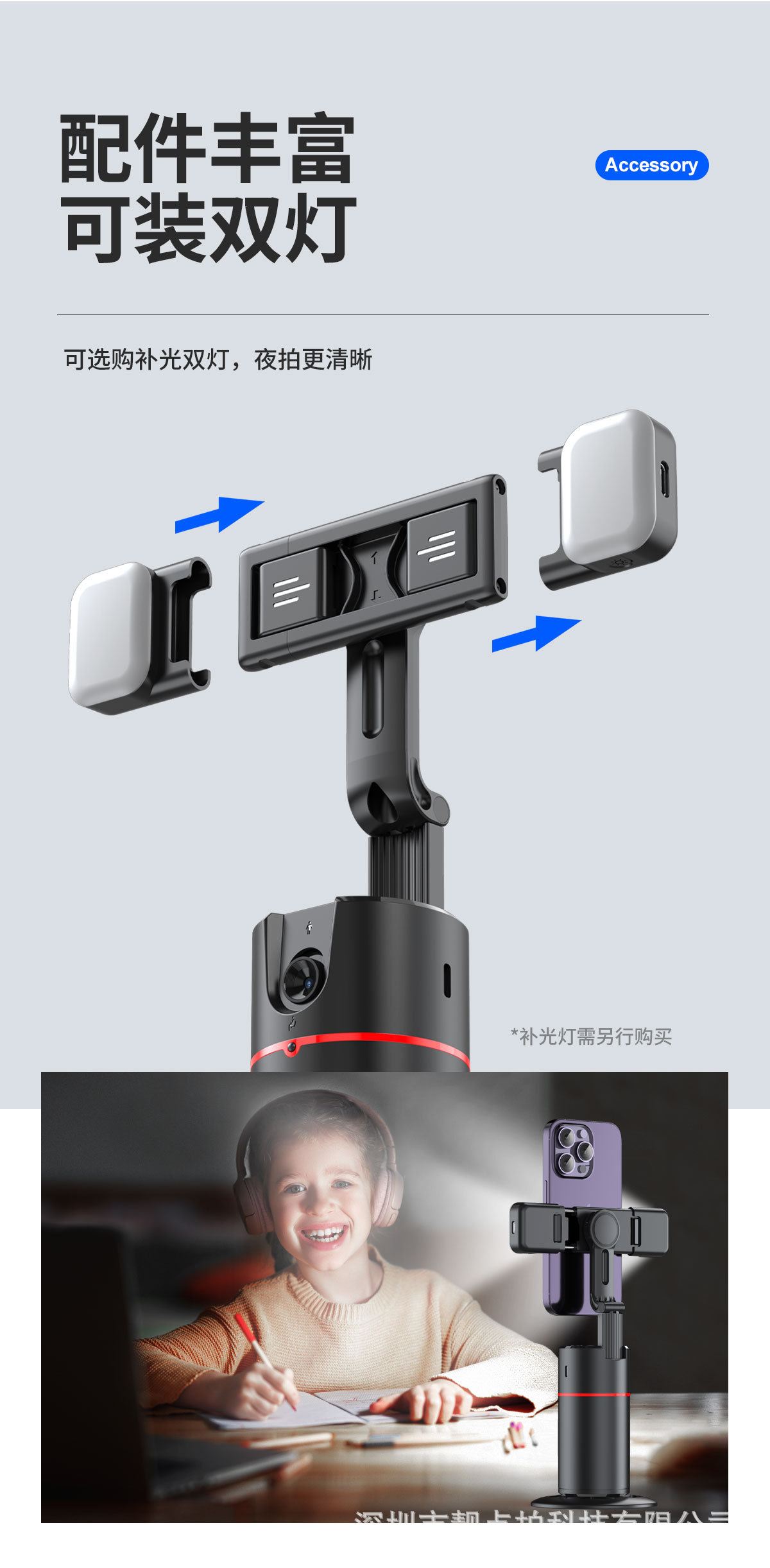 • [P02D-블랙] 듀얼라이트 + 스마트 추적 + 360도 회전 + 텔레스코픽 암 + 리모콘