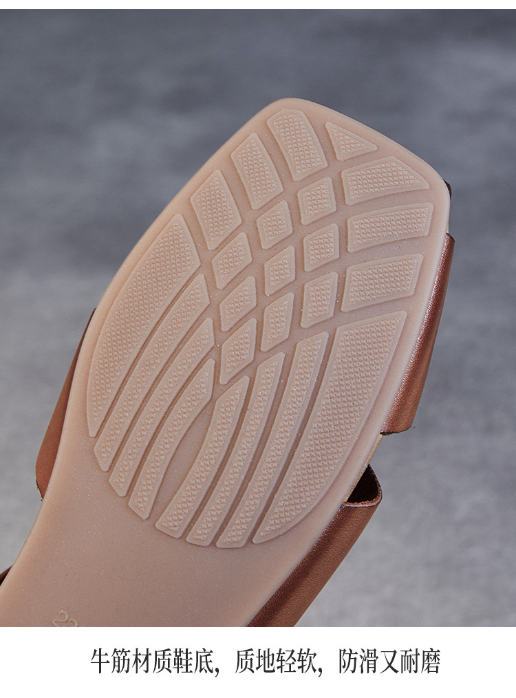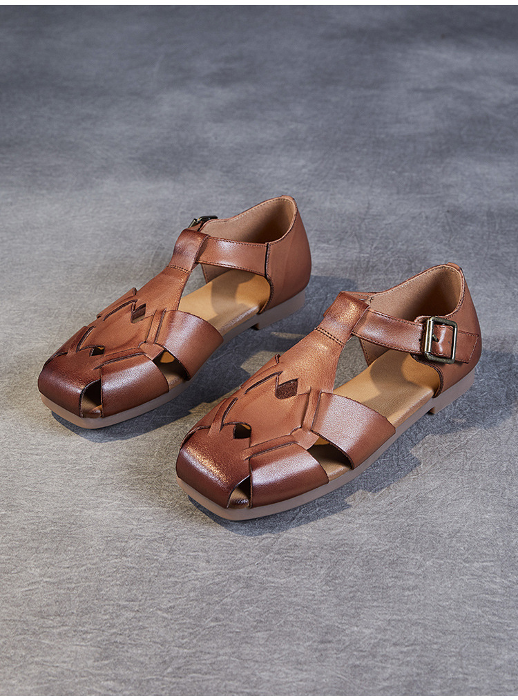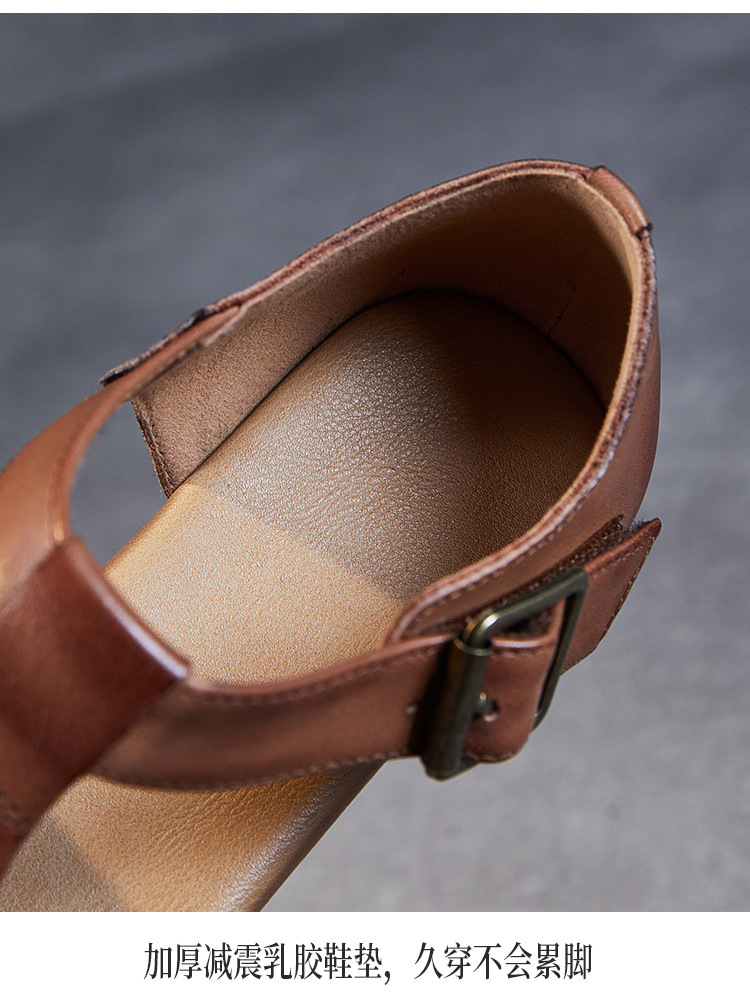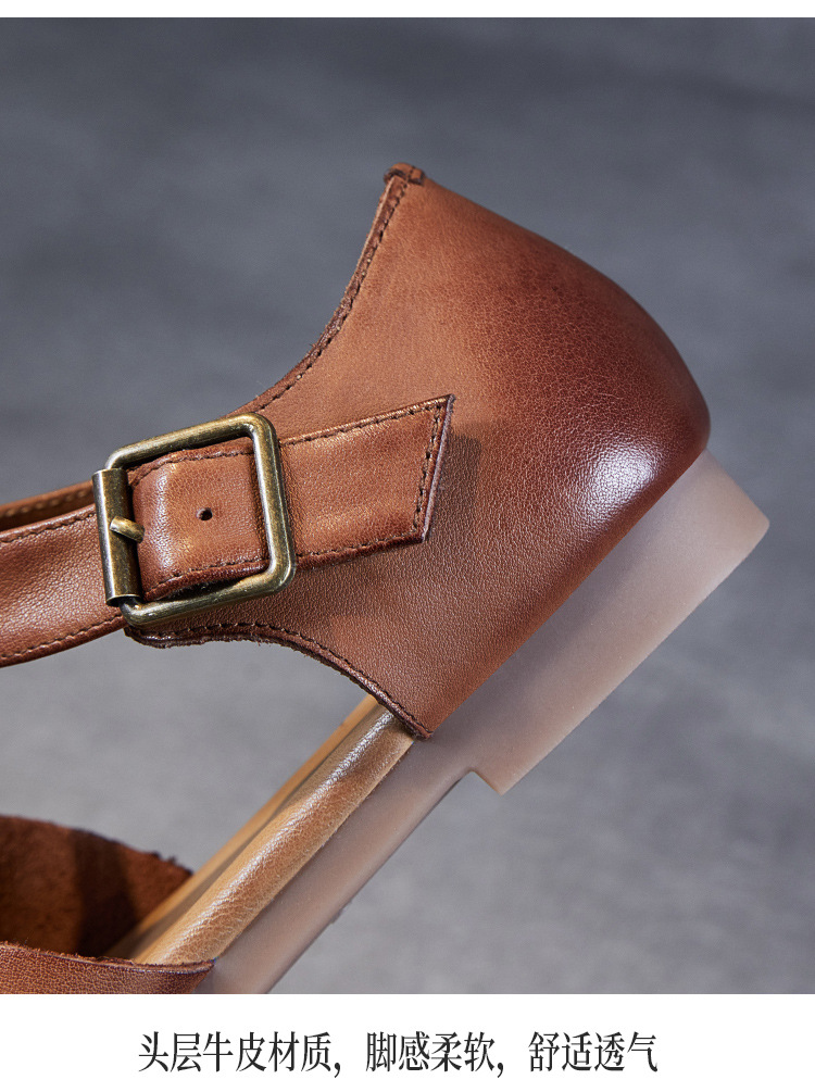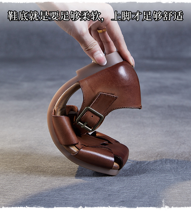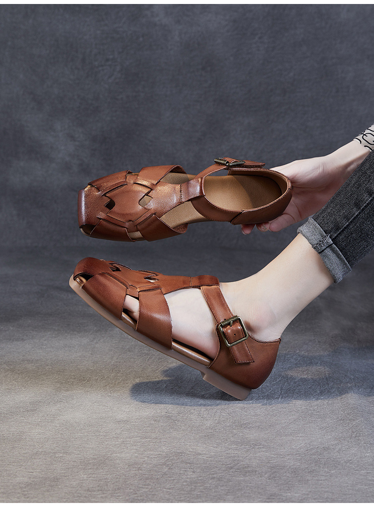 부드러운 바닥 부드러운 표면 플랫 샌들 여성 여름 한 단어 버클 컷 아웃 돼지 케이지 신발 정품 가죽 빈티지 로마 신발 플랫 힐 여성 신발