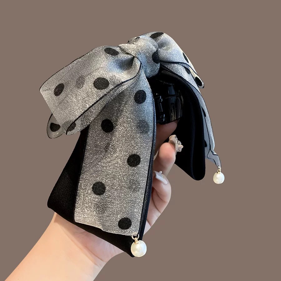 한국식 폴카 도트 리본 포니테일 클립, 고급스럽고 우아한 진주 펜던트, 반묶음 머리핀, 여성용 샤크 클립 헤어 액세서리