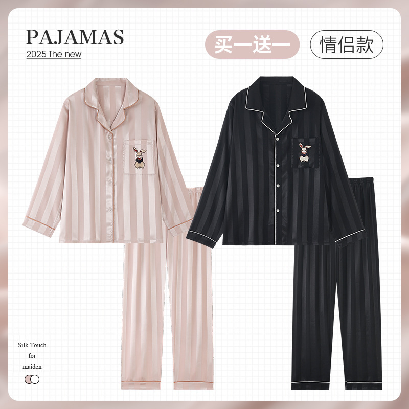 남성과 여성을 위한 고급 캐주얼 스트라이프 잠옷, 봄과 가을 얼음 실크 긴팔 실크 여름 남성 가정복스토어 가기