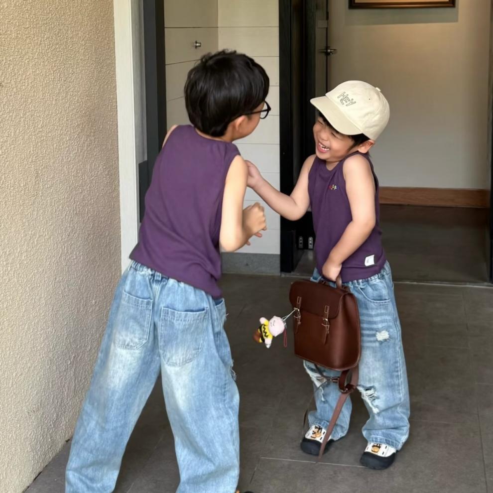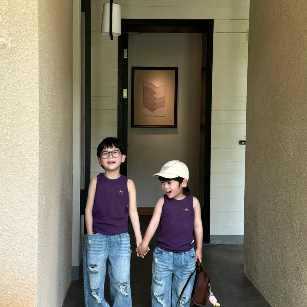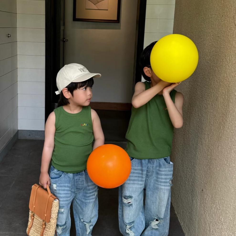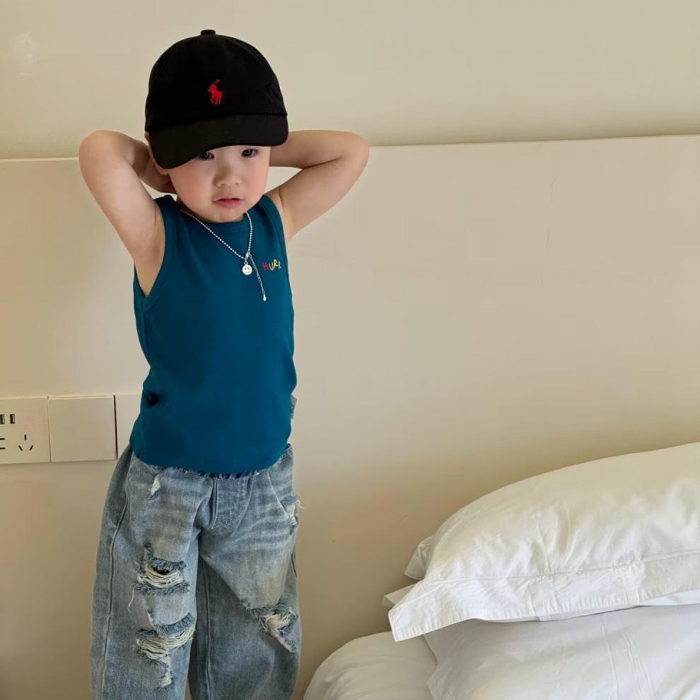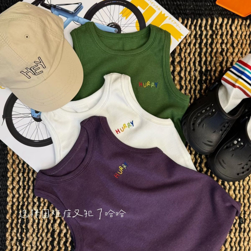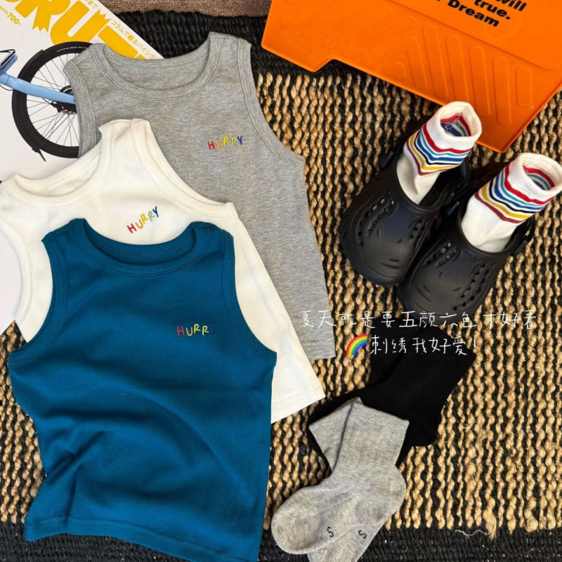 멀티 컬러 ~ 아동 여름 한국 스타일 서양식 문자 자수 라운드 넥 조끼 소년 캐주얼 티셔츠 아동용 탑