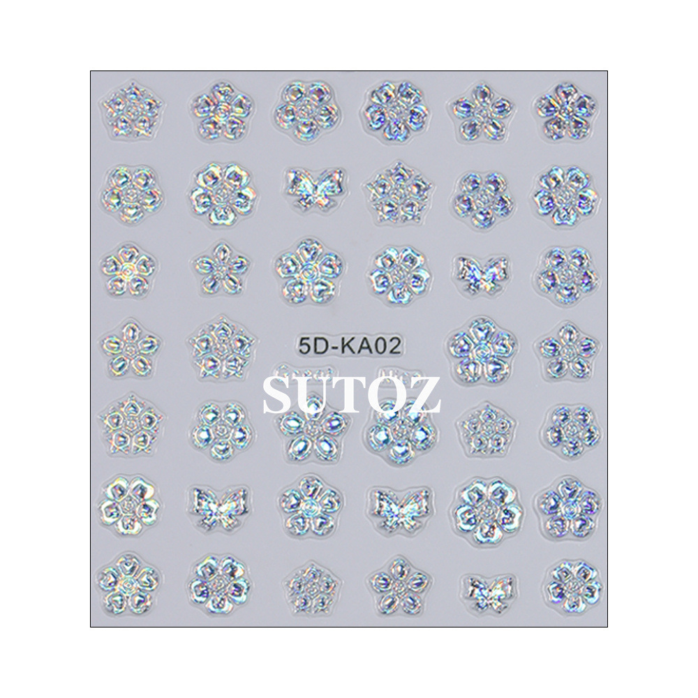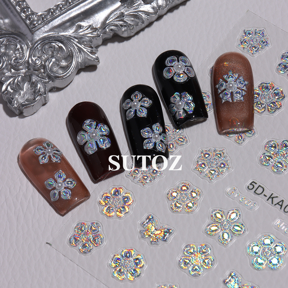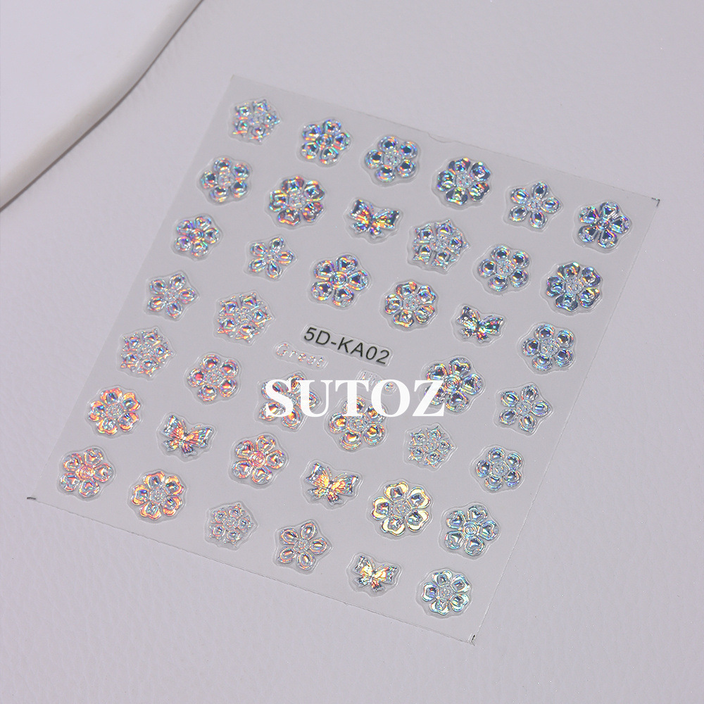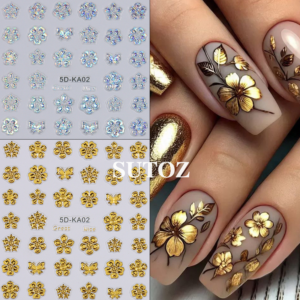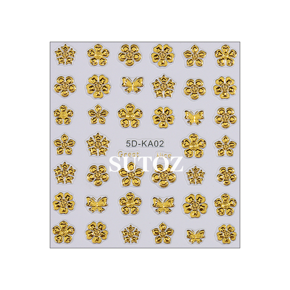 국경 핫 엠보싱 네일 아트 스티커 도매 가벼운 럭셔리 3 차원 컬러 5 꽃잎 꽃 나비 손톱 5D 접착제 데칼스토어 가기