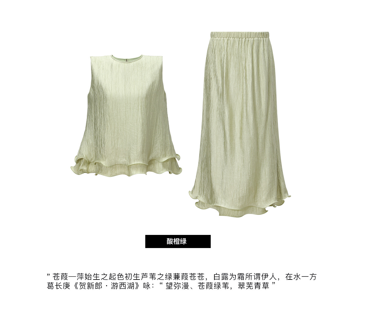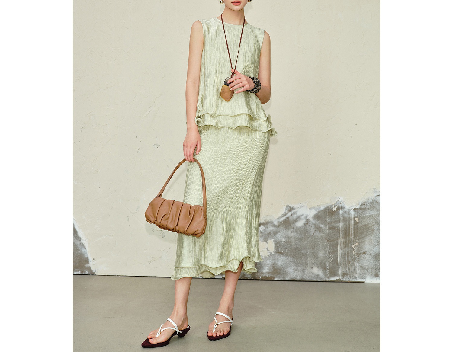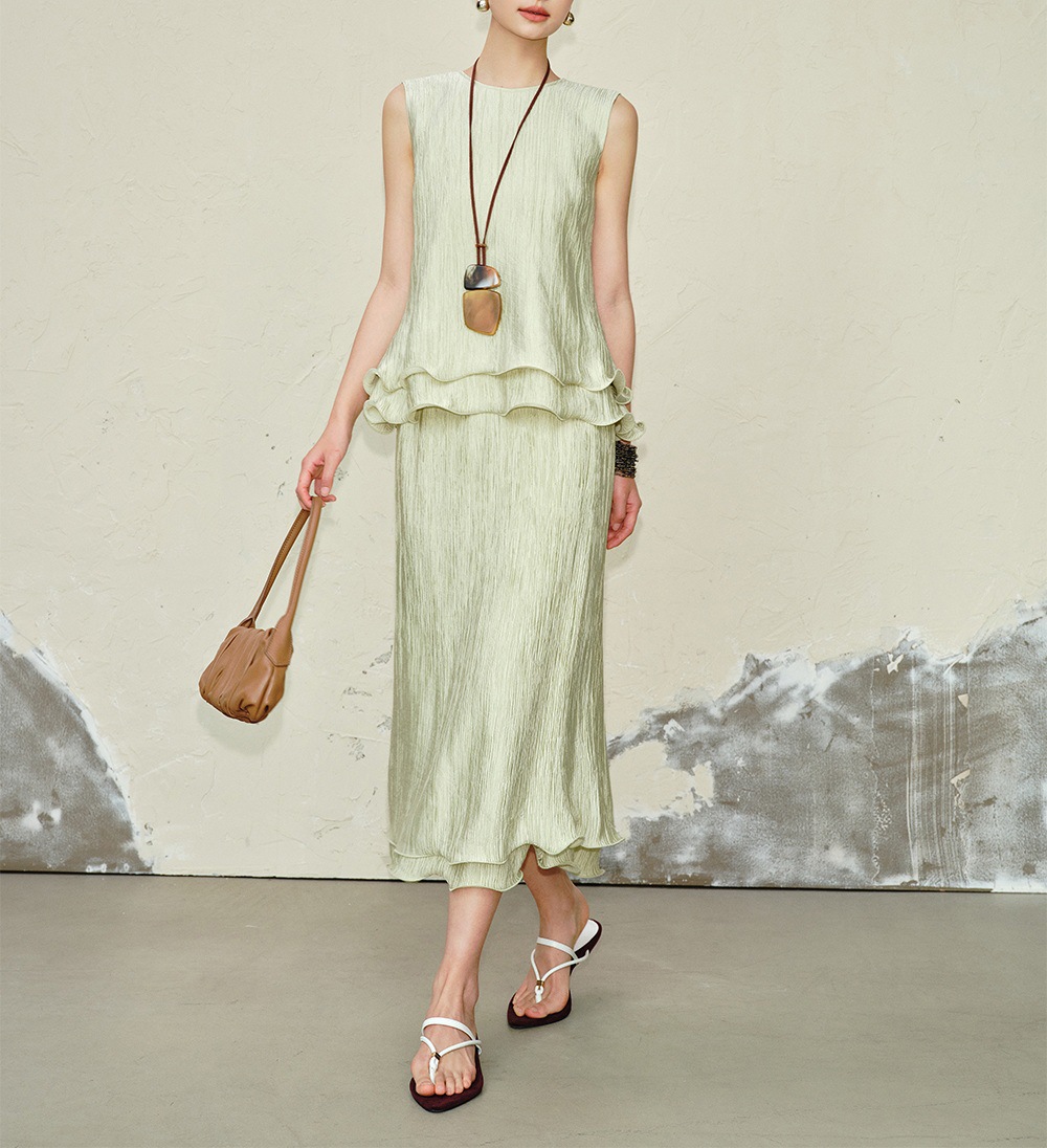 2025 여름 새로운 뷰티 주름 민소매 크루 넥 티셔츠 스커트 미야케, 여성용 세트 착용