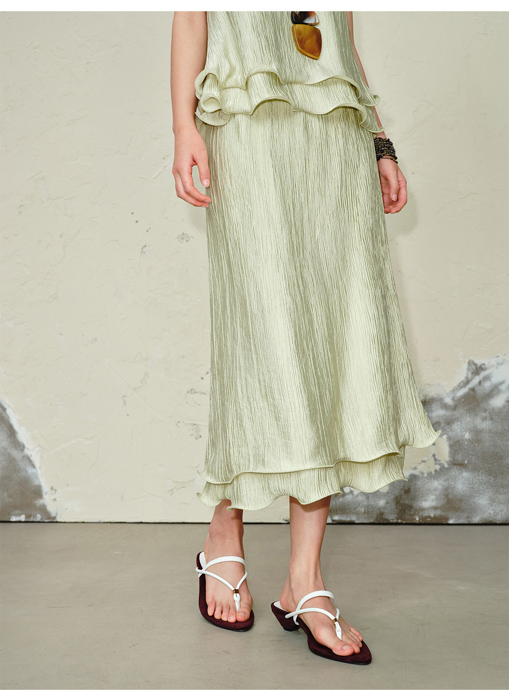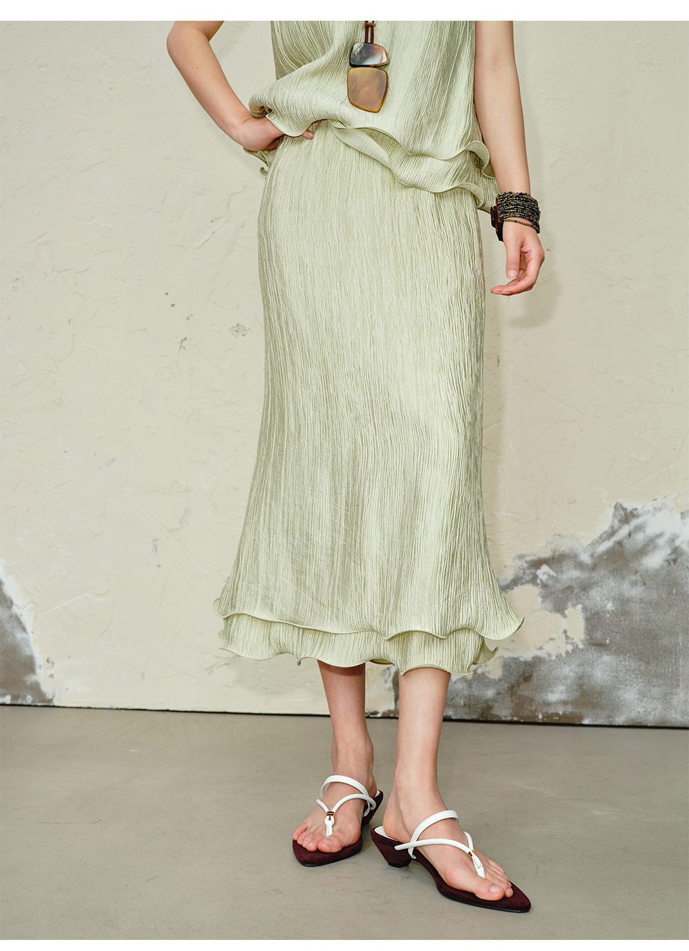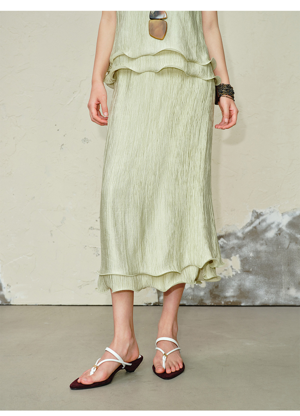 2025 여름 새로운 뷰티 주름 민소매 크루 넥 티셔츠 스커트 미야케, 여성용 세트 착용