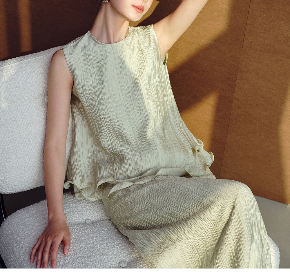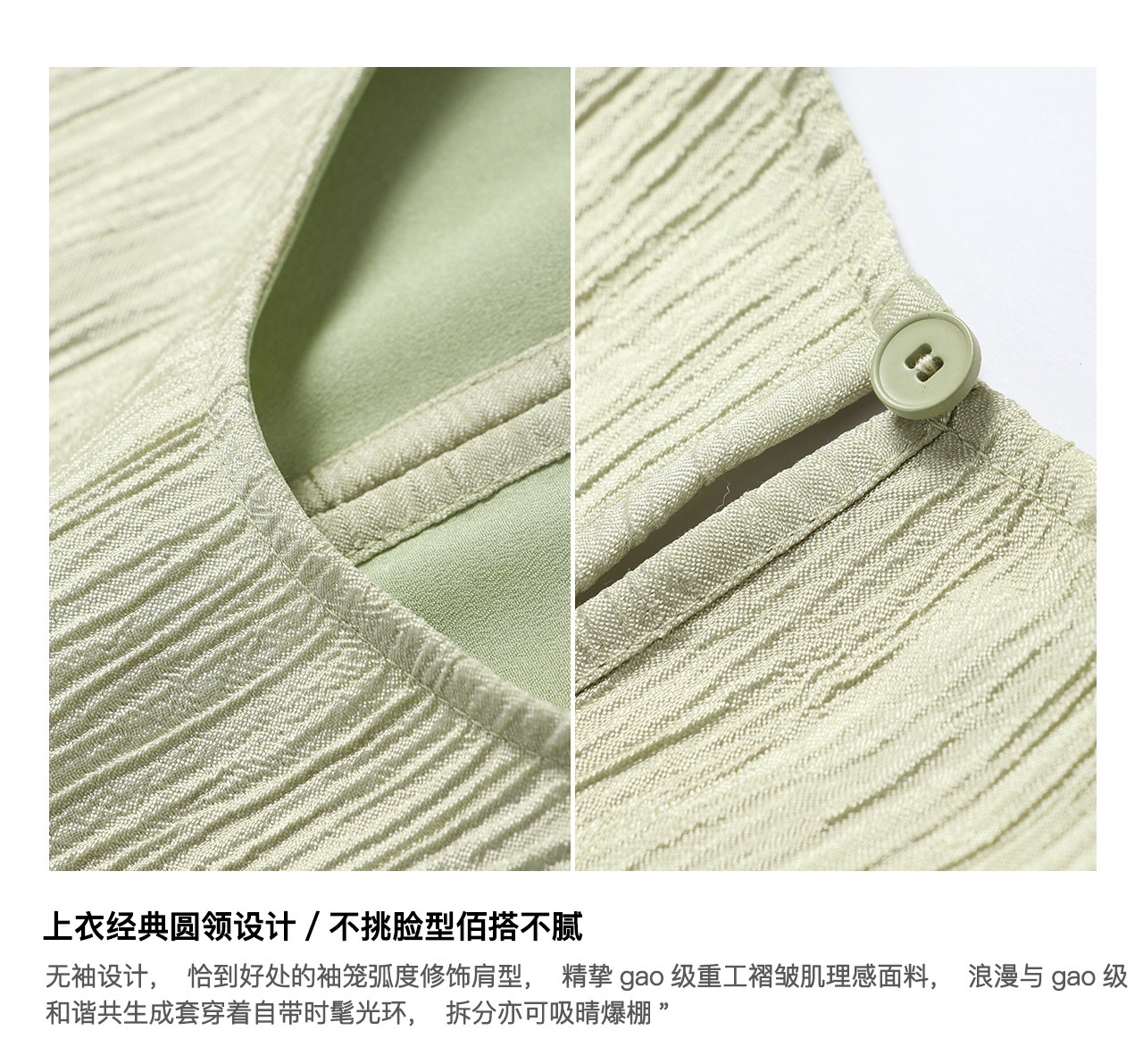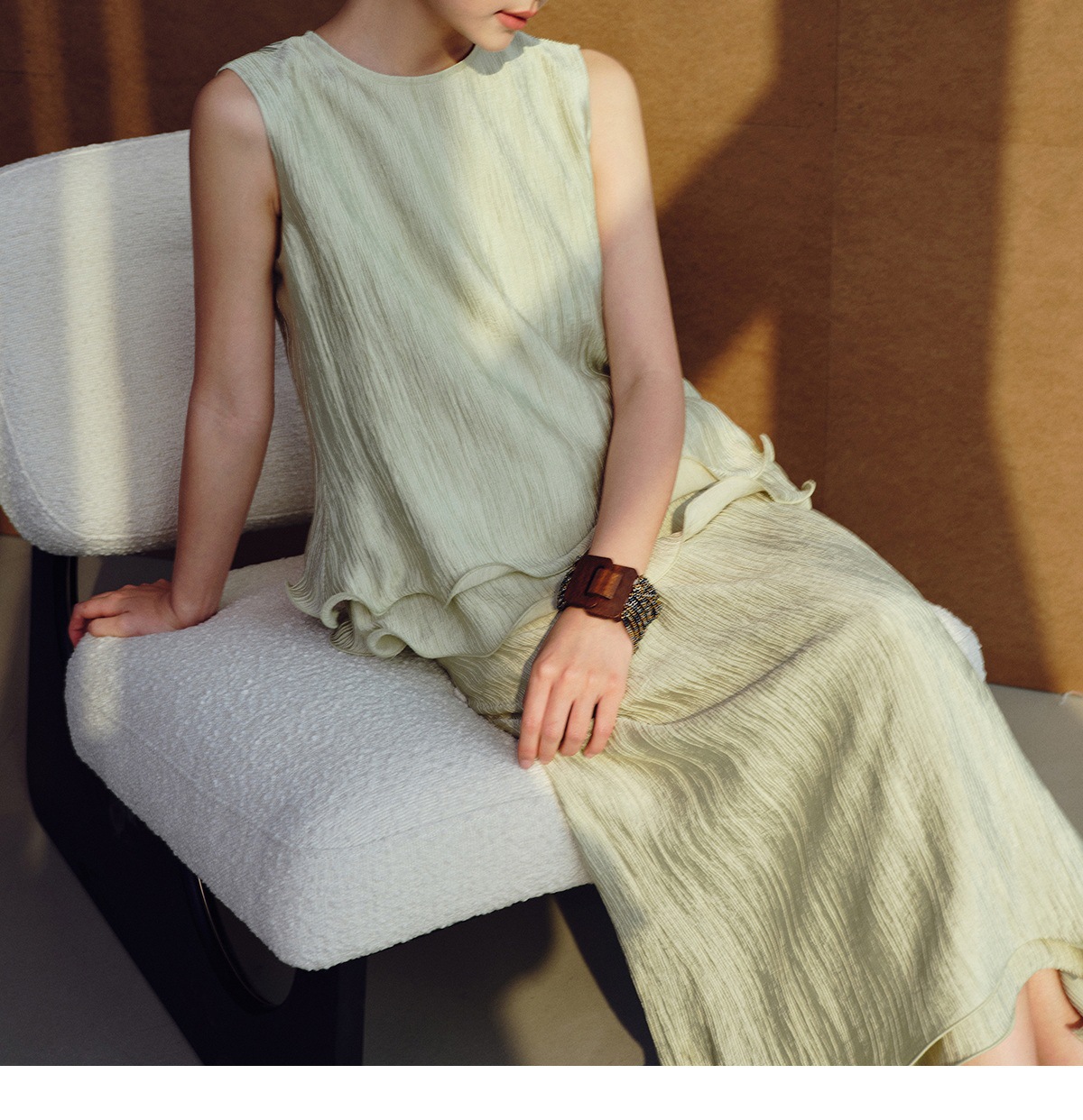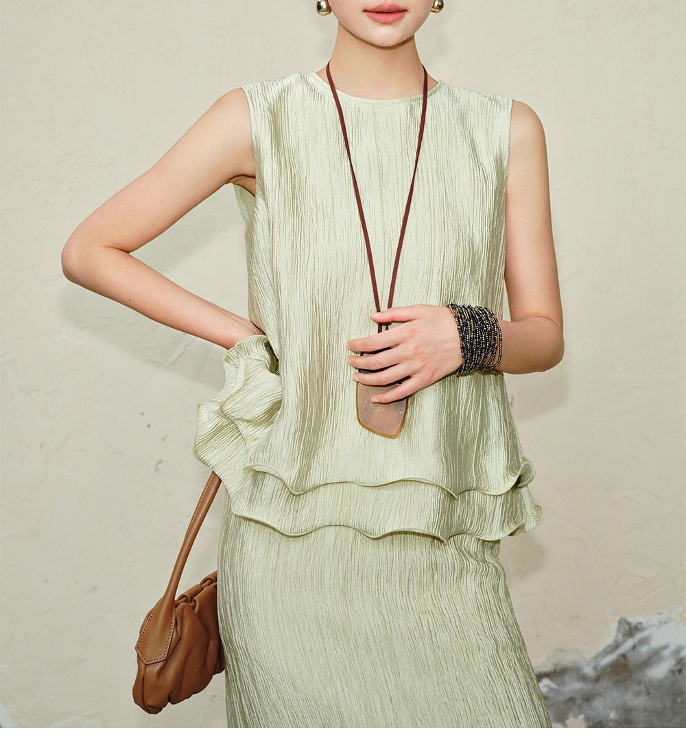 2025 여름 새로운 뷰티 주름 민소매 크루 넥 티셔츠 스커트 미야케, 여성용 세트 착용스토어 가기