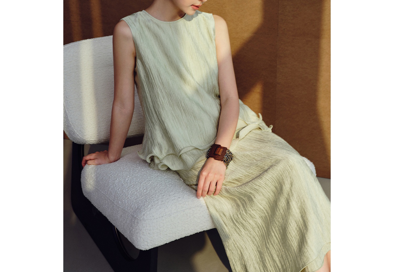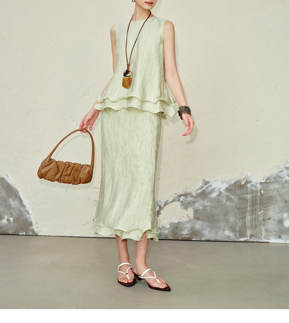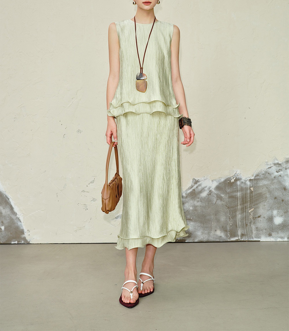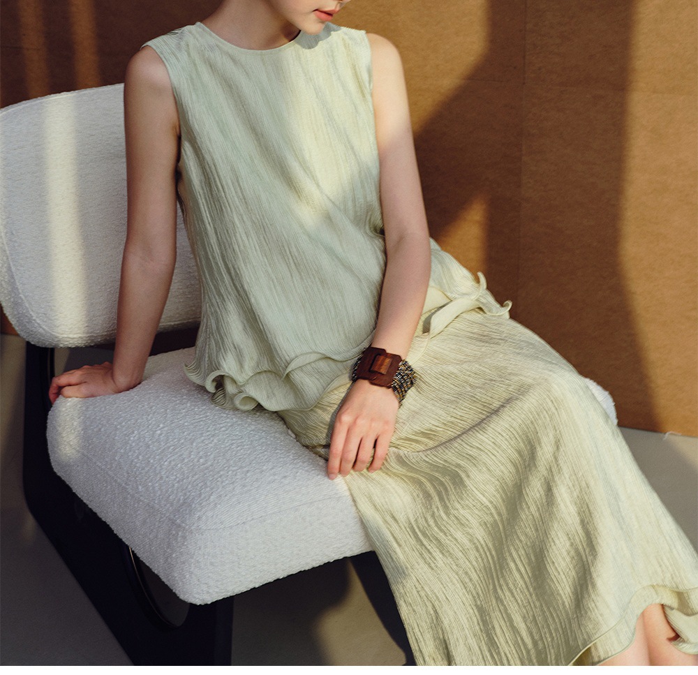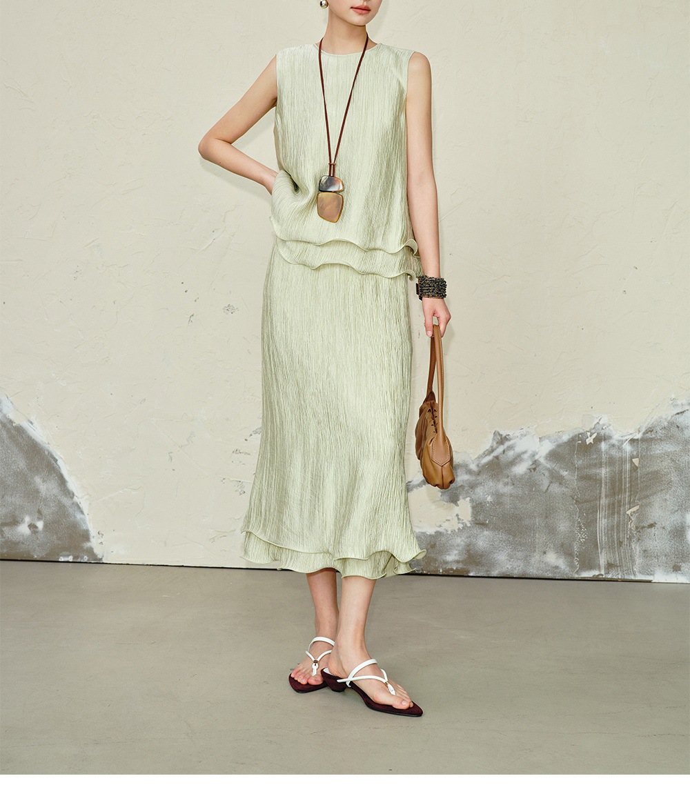 2025 여름 새로운 뷰티 주름 민소매 크루 넥 티셔츠 스커트 미야케, 여성용 세트 착용스토어 가기