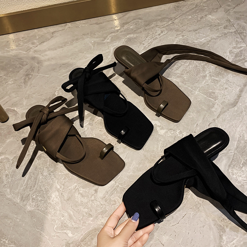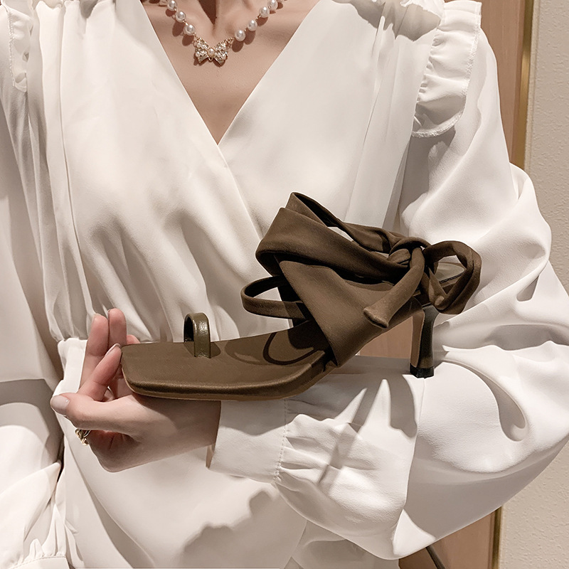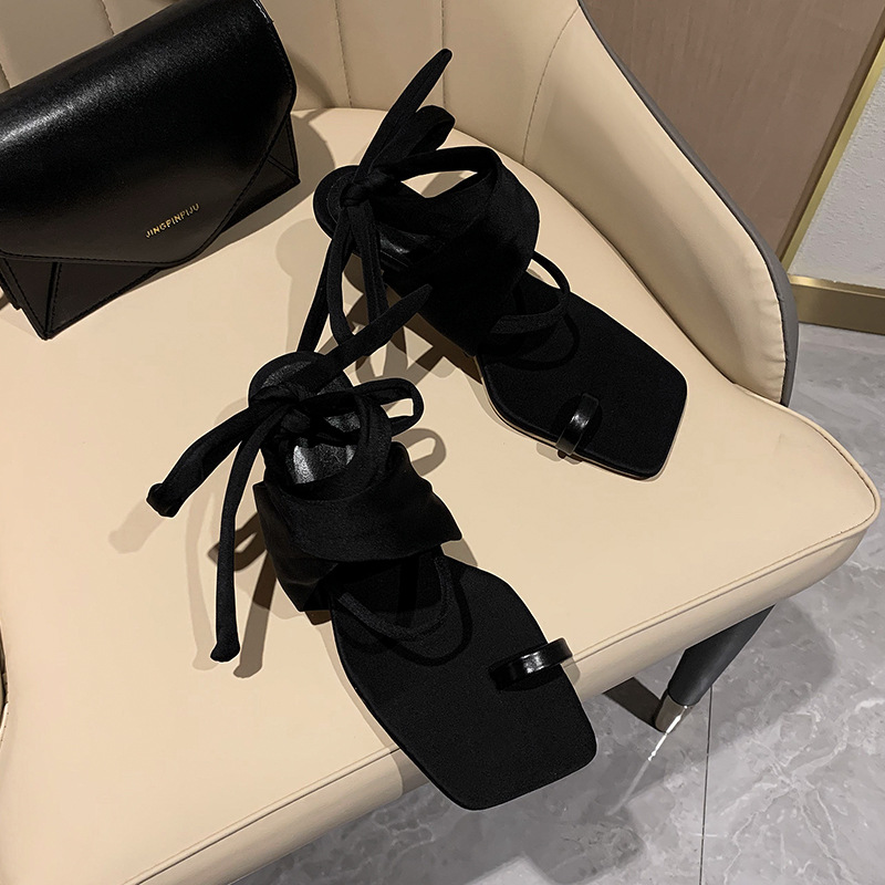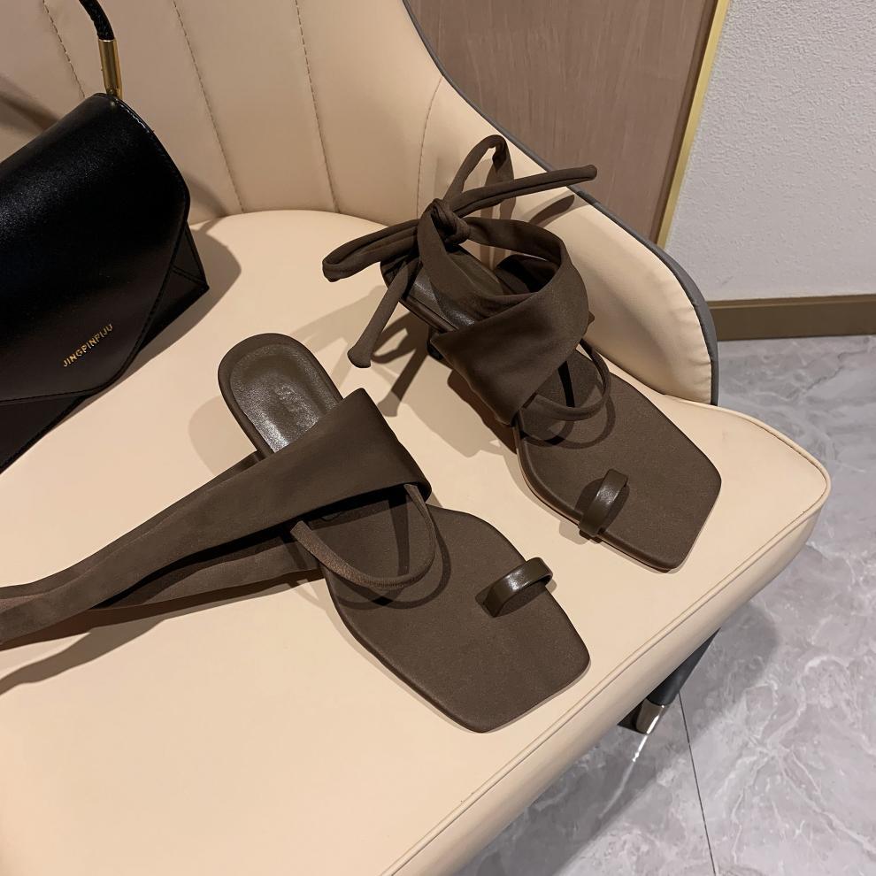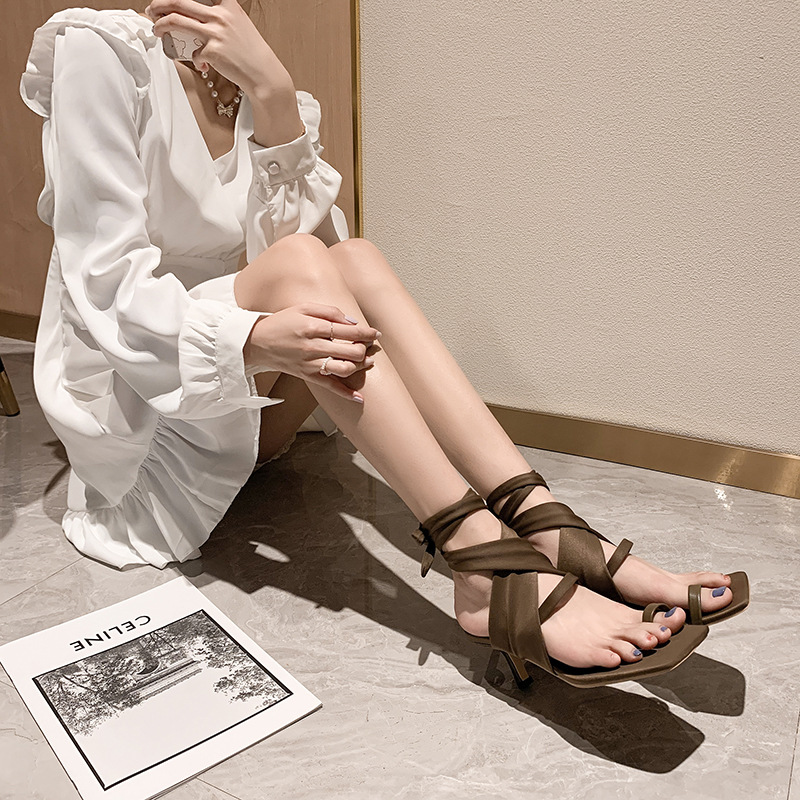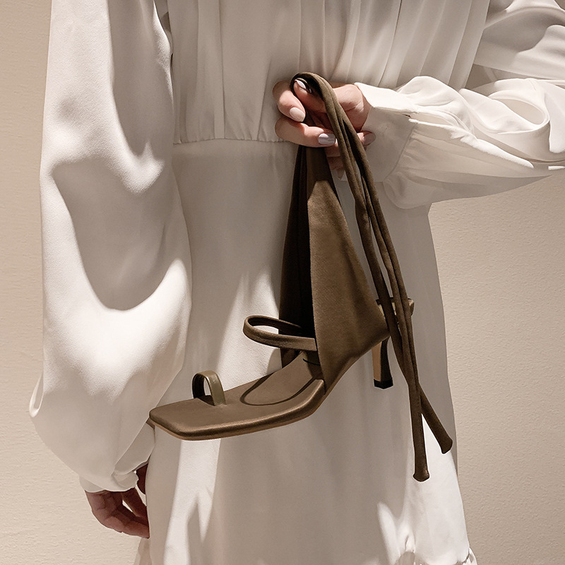 2025 여름 새로운 한국식 패션 신발 헝겊으로 덮인 클립 발가락 스트랩 샌들 파인 힐 스퀘어 발가락 하이힐 여성 신발 로마 신발스토어 가기