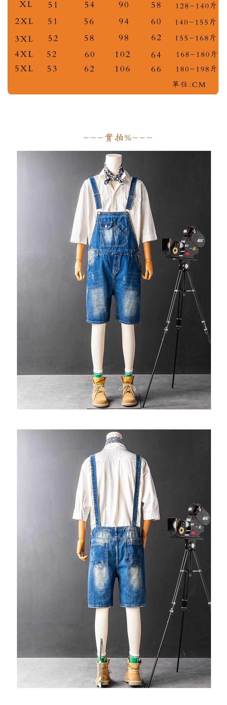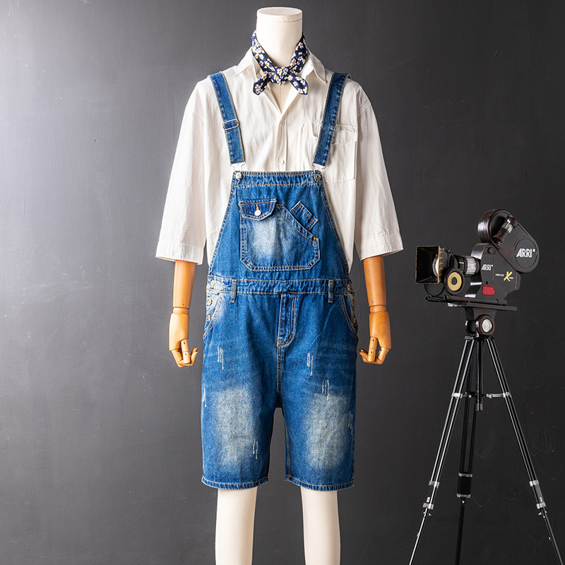 유럽과 미국의 트렌디한 브랜드 데님 멜빵 바지 남성 여름 찢어진 워싱 반바지 남성과 여성 청소년 연령 감소 원피스 멜빵 바지
