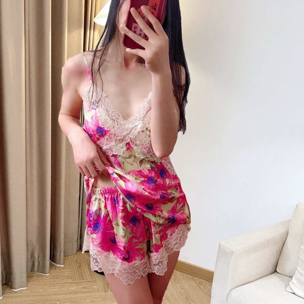 • YL 레이스 아이스 실크 잠옷 - 핑크 꽃
