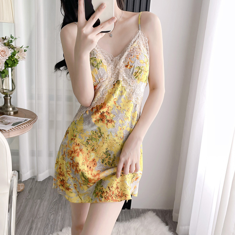 • YL 레이스 아이스 실크 잠옷 - 골든 옐로우