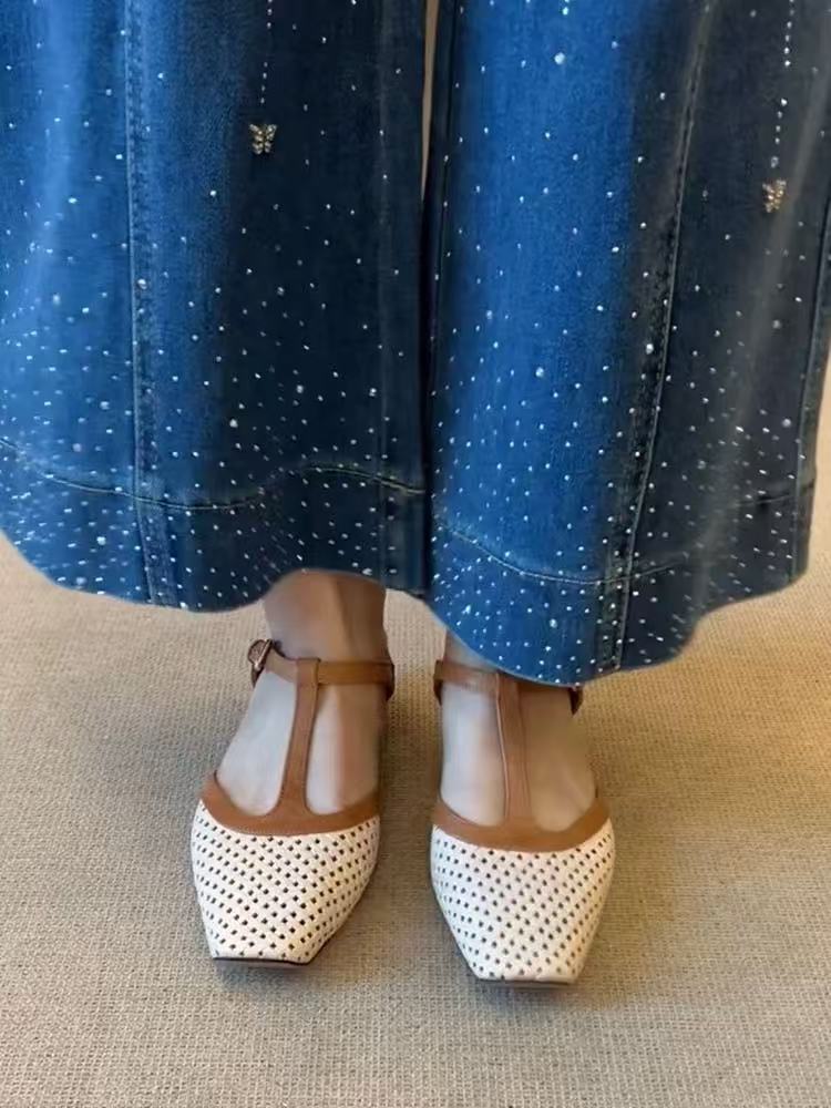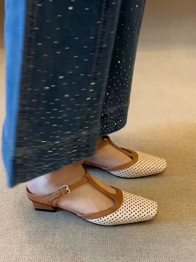 2025 여름 복고풍 부드러운 밑창 스퀘어 토 컬러 블록 T-스트랩 짠 중공 샌들 여성 통근용 두꺼운 굽 발가락 샌들