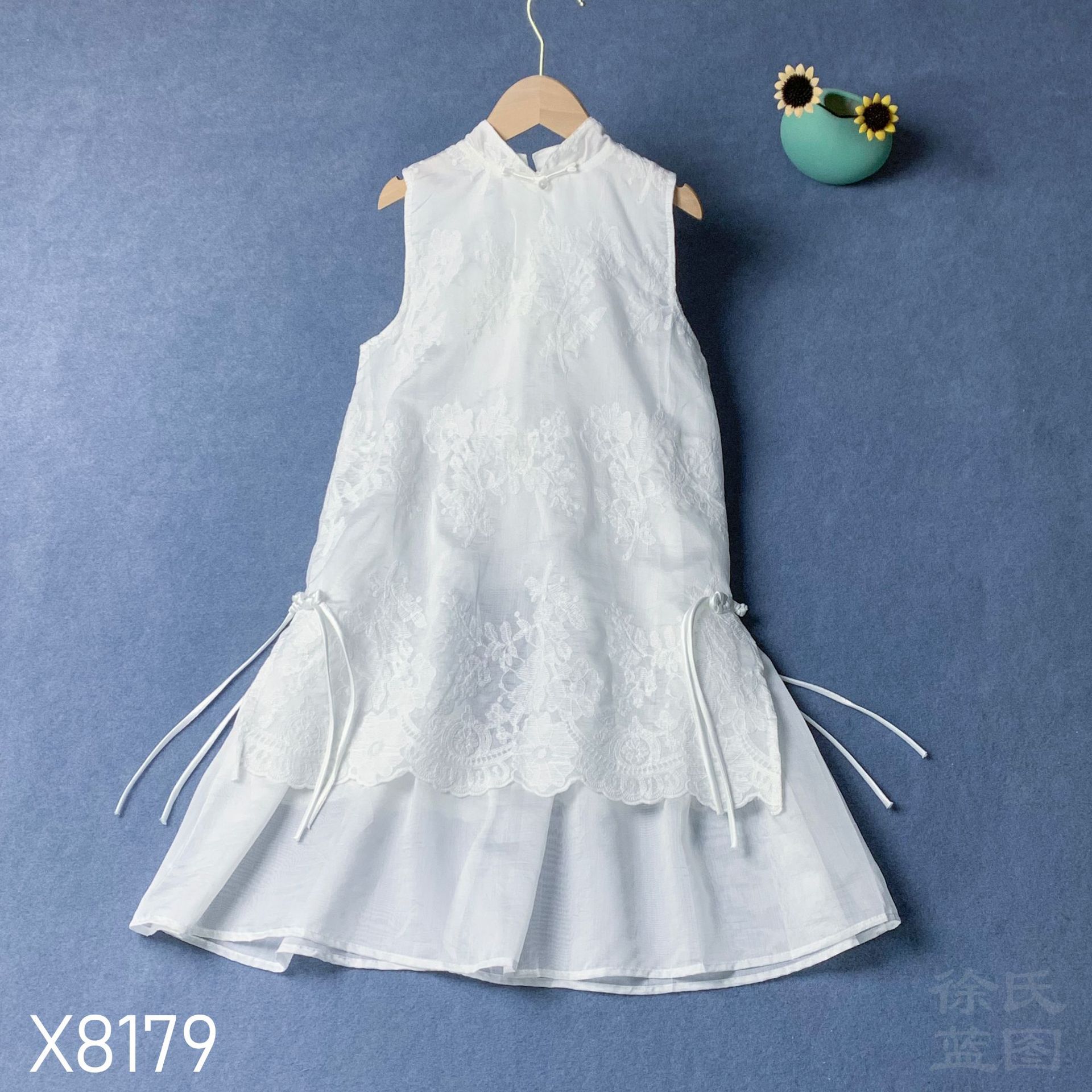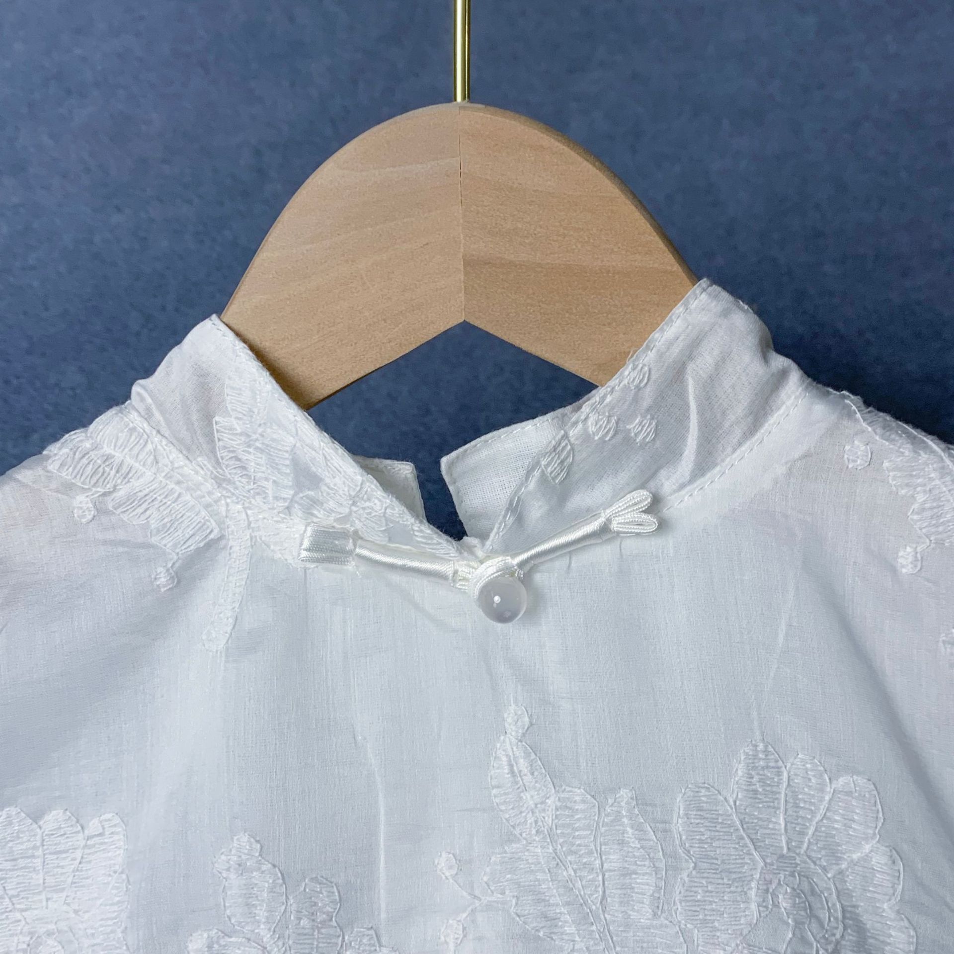 타이 염색 흰색 소녀 흰색 드레스 중국 스타일 어린이 여름 드레스 스탠드 칼라 민소매 수 놓은 아동 의류 치파오 드레스