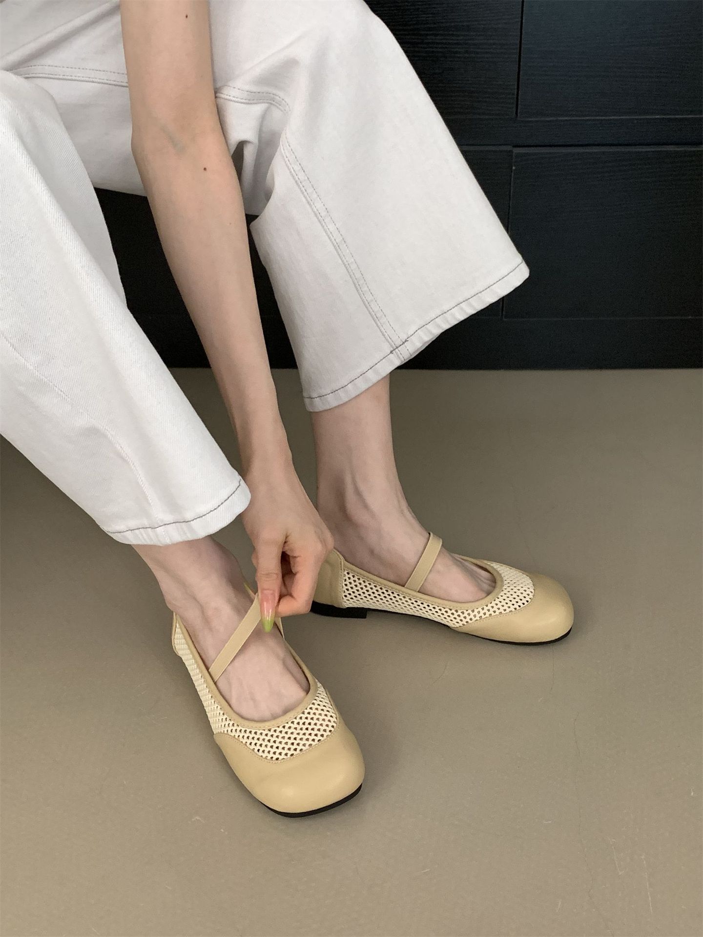 2025년 여름 한국식 프렌치 복고 라운드 투 니치 메쉬 중공 플랫 캐주얼 발레 스타일 발레 슈즈