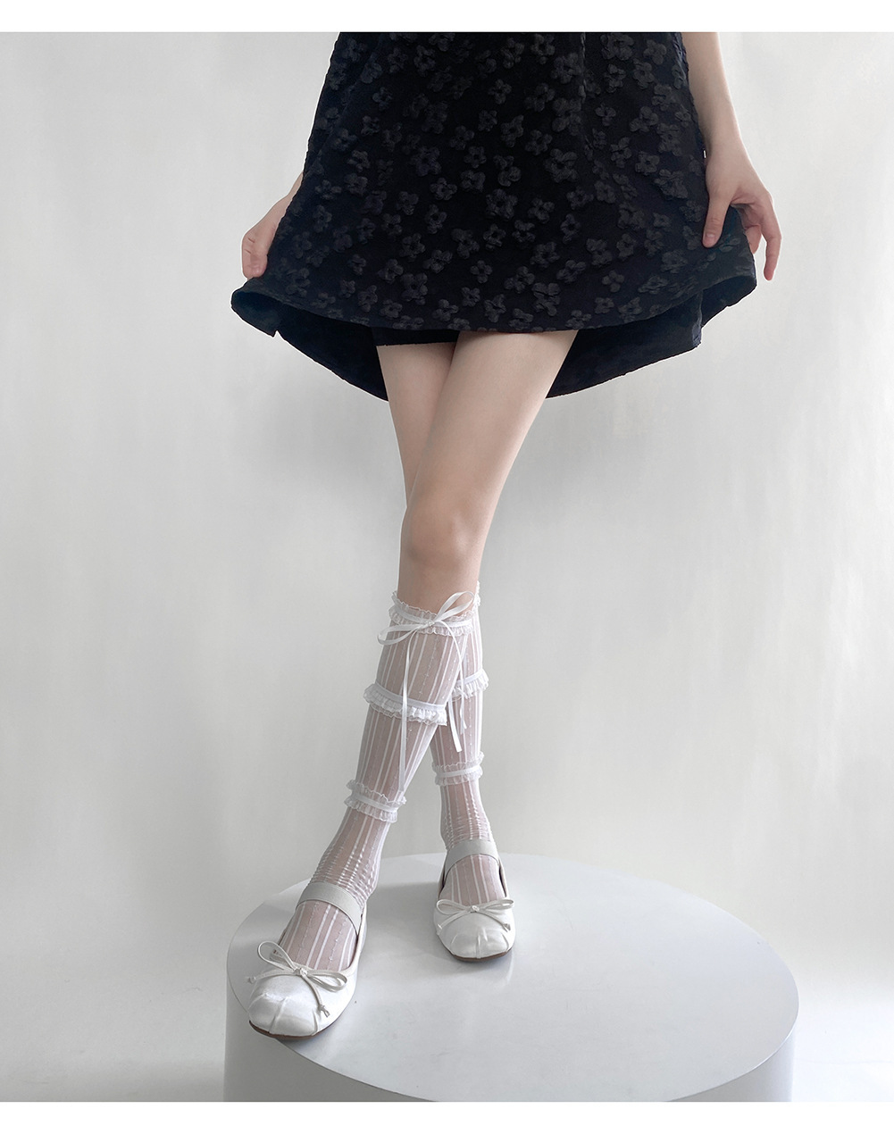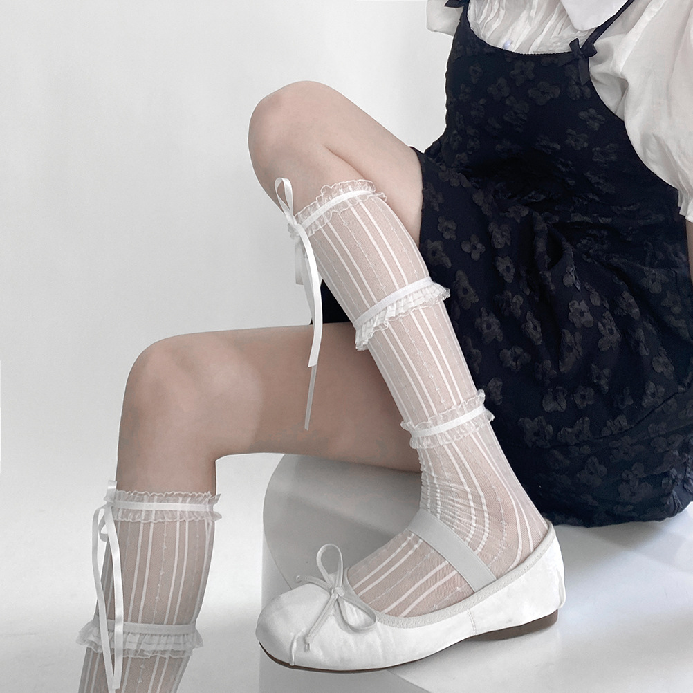 발레 스타일 메리 제인 화이트 레이스 보우 종아리 양말 여름 초박형 미드 튜브 jk 양말