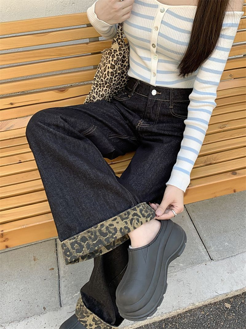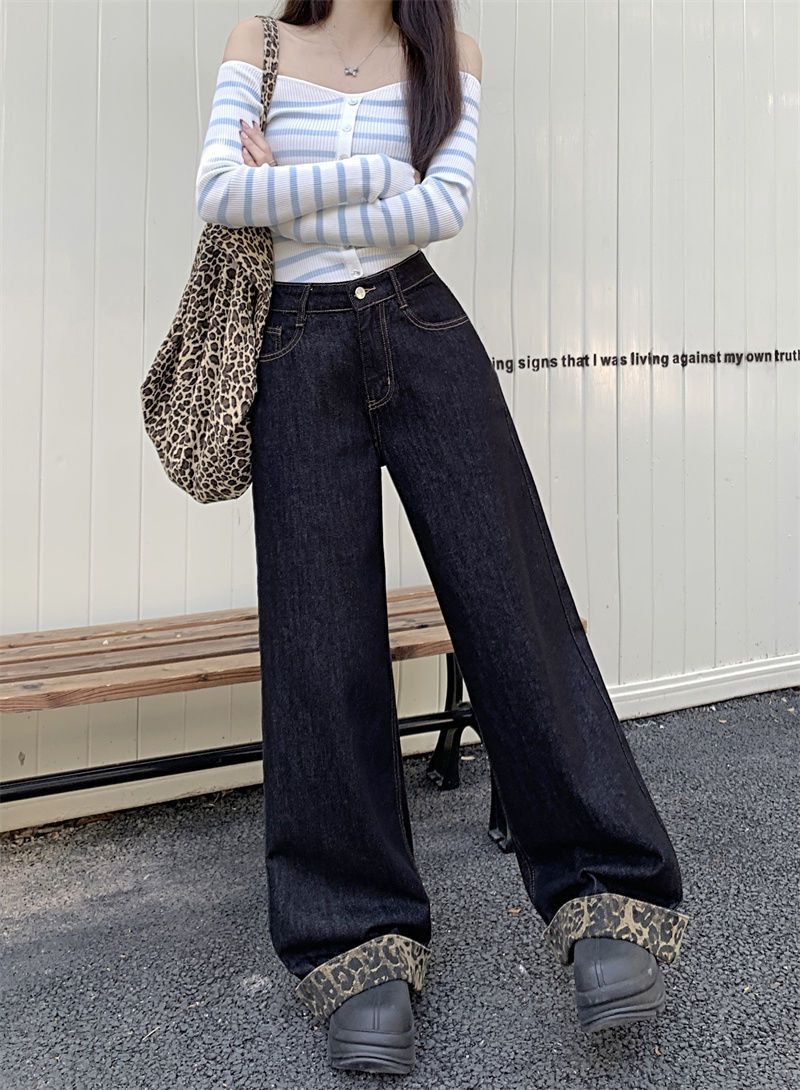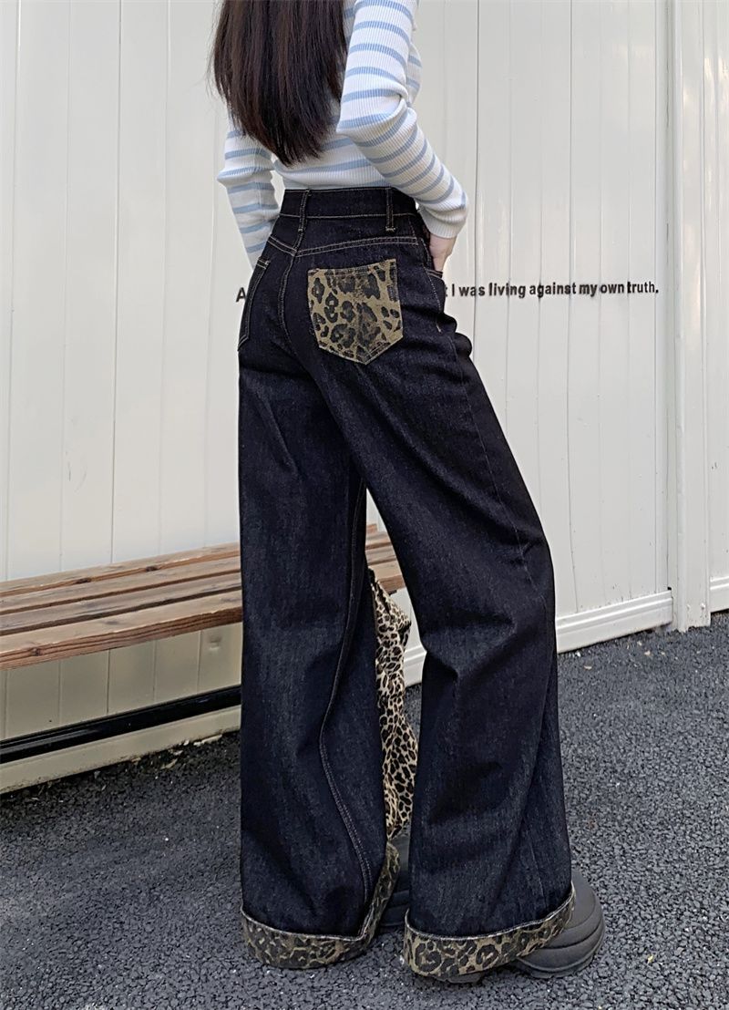 여성을위한 컬링 레오파드 프린트 와이드 레그 청바지 2025 봄, 가을 새로운 슬리밍 바닥 길이 루즈 스트레이트 바지