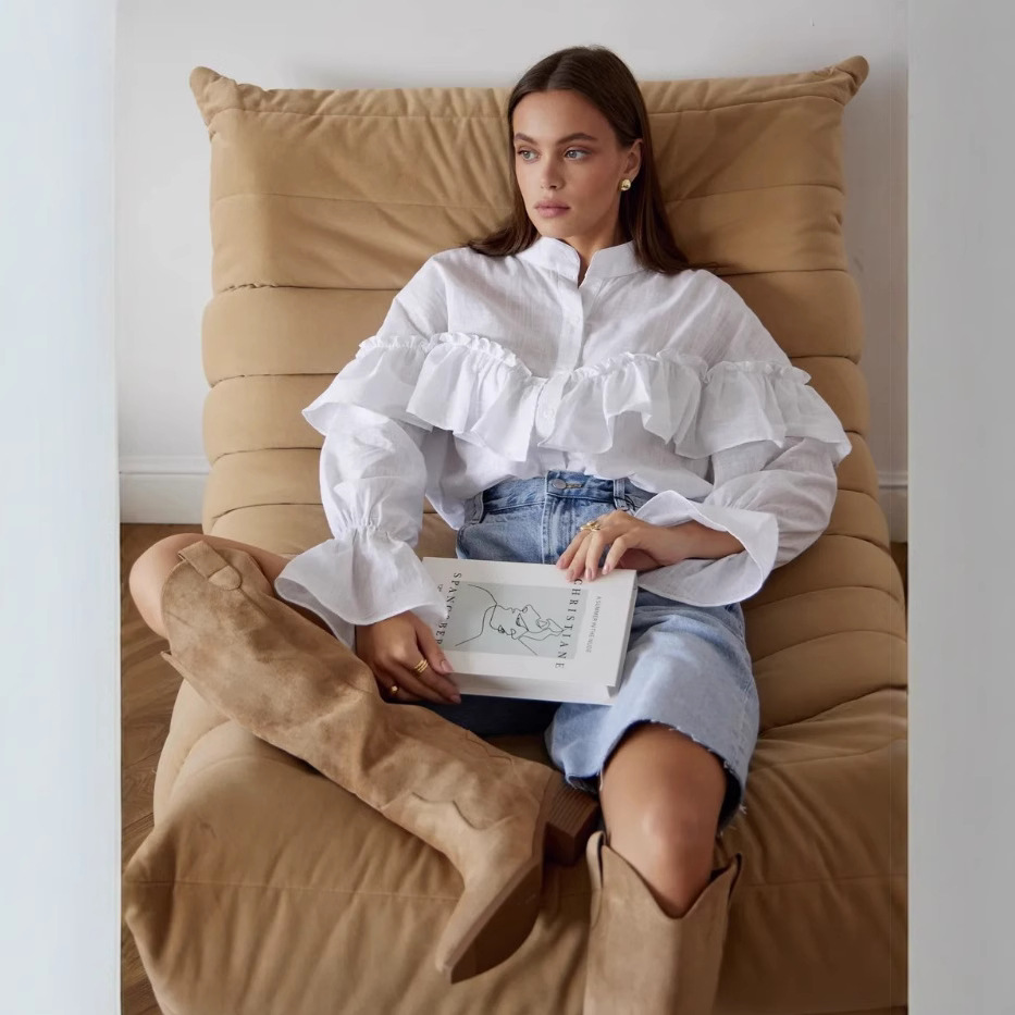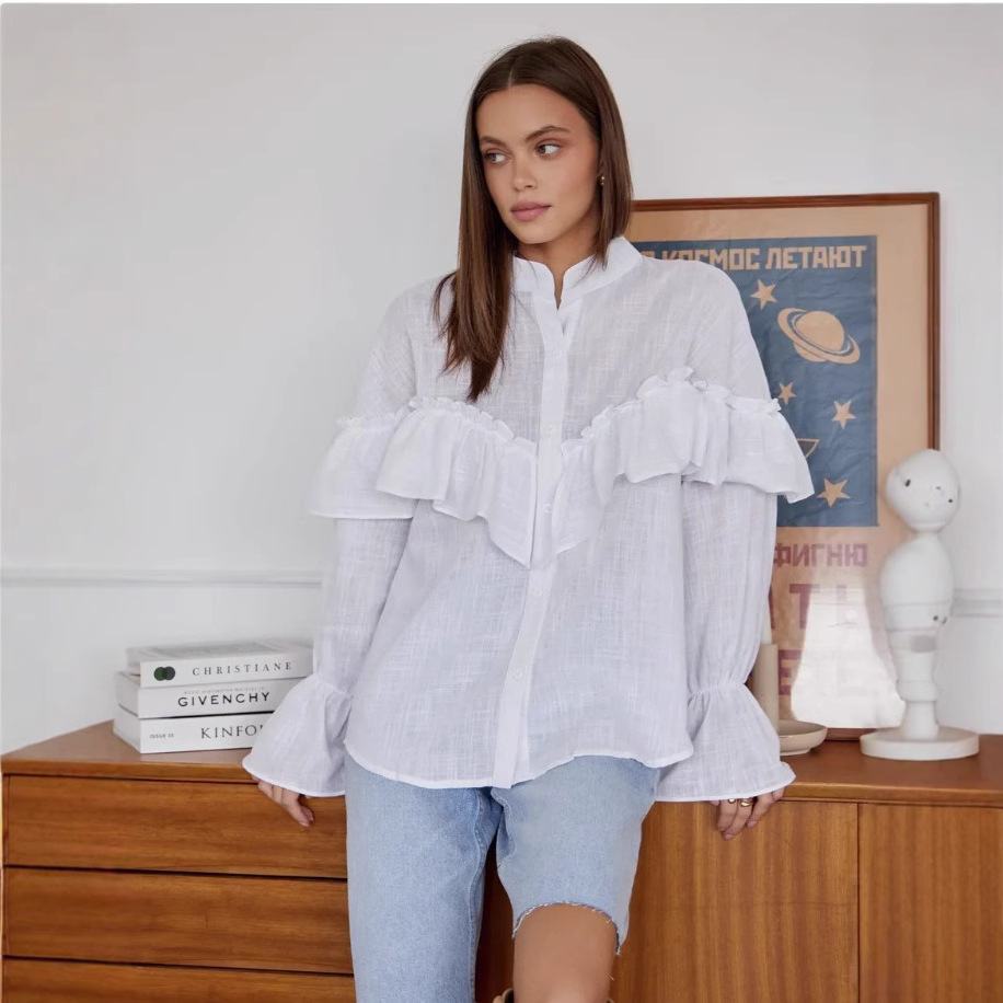 2025 봄 신상품 유럽과 미국의 국경 간 여성 스트리트 패션 계층화 된 장식 프릴 셔츠 긴팔 탑스토어 가기