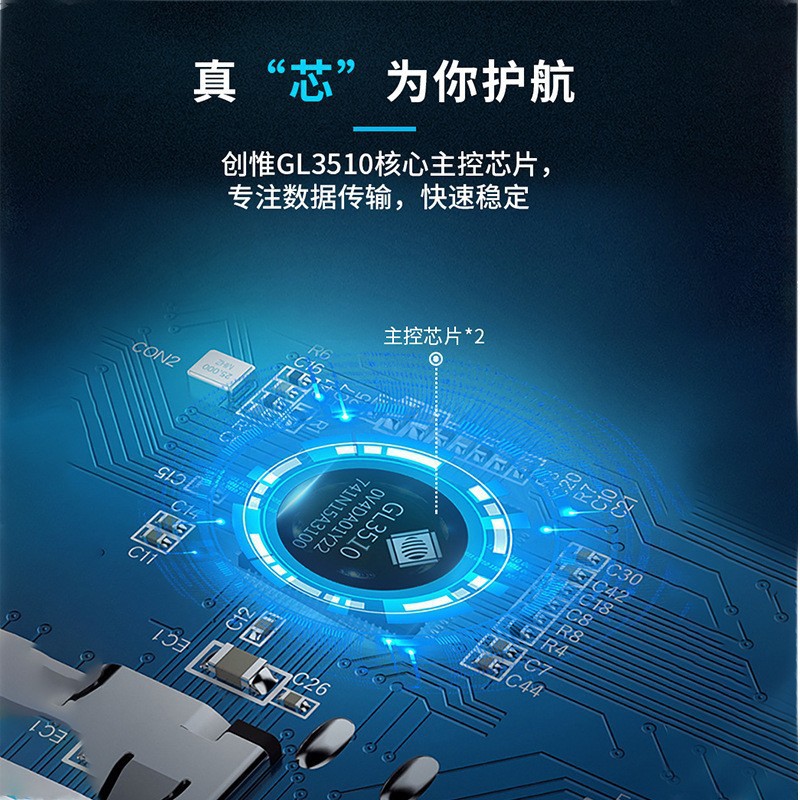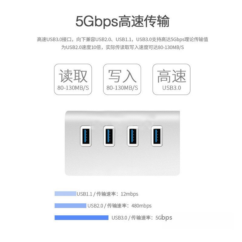 1. 配备GL3520 扩展芯片,为我们快速扩展 4 个 USB3.0 高速传输接口。高性能主控芯片确保每个 USB3.0 接口均匀运行,理论高速带宽达 5Gbps,方便多台设备同时使用。