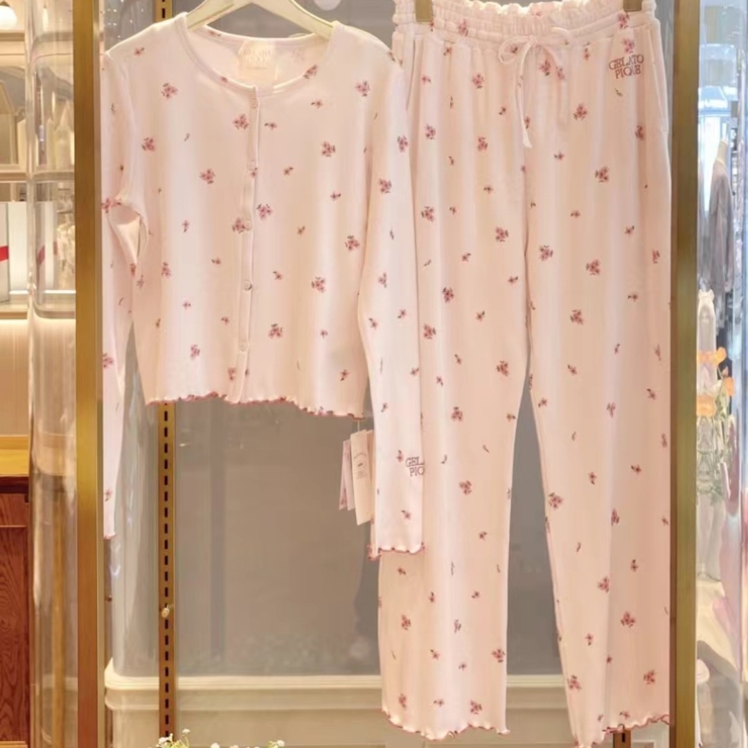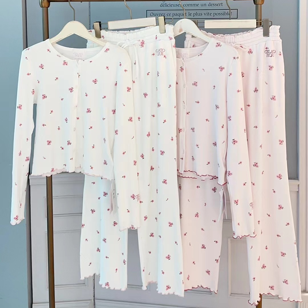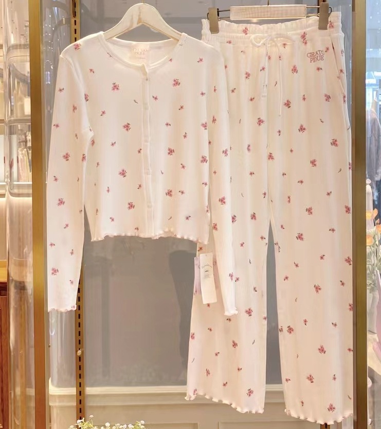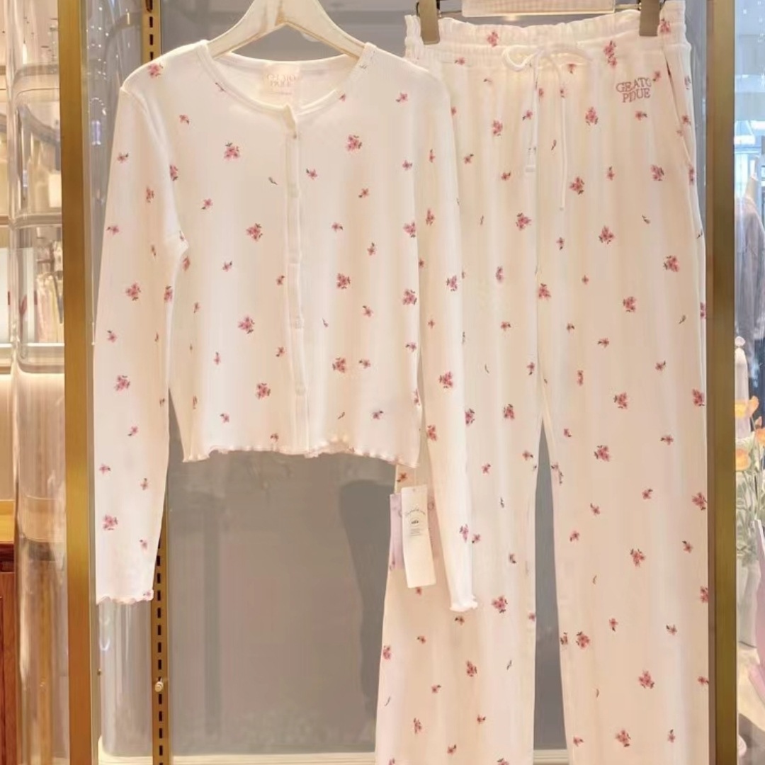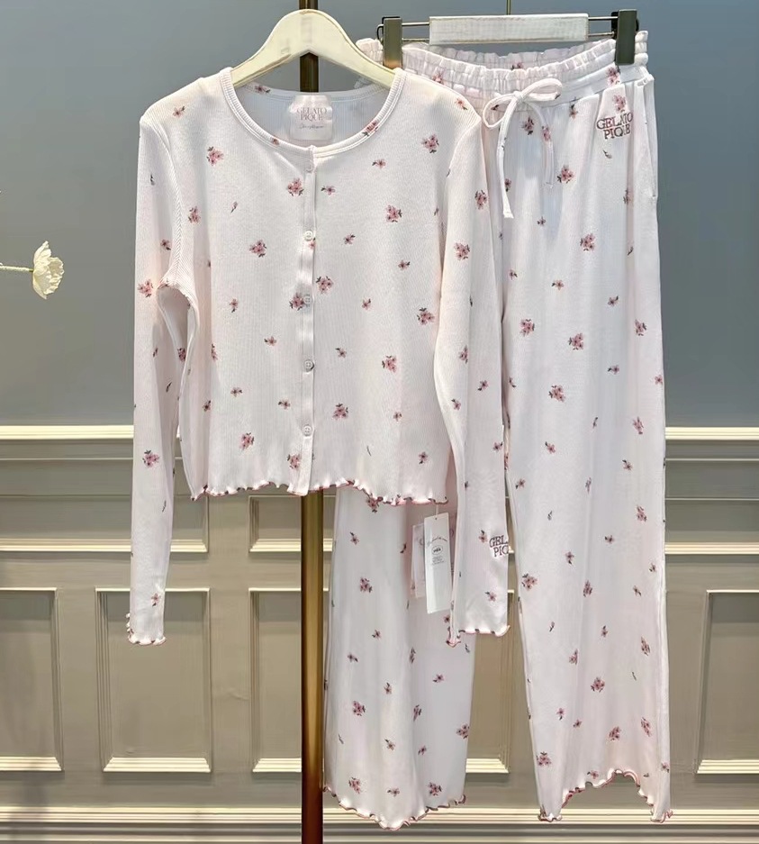 gp 무라벨 오리지널 부드러운 봄면 귀여운 만화 프린트 라운드넥 긴팔 레이스 여성 홈웨어 세트스토어 가기