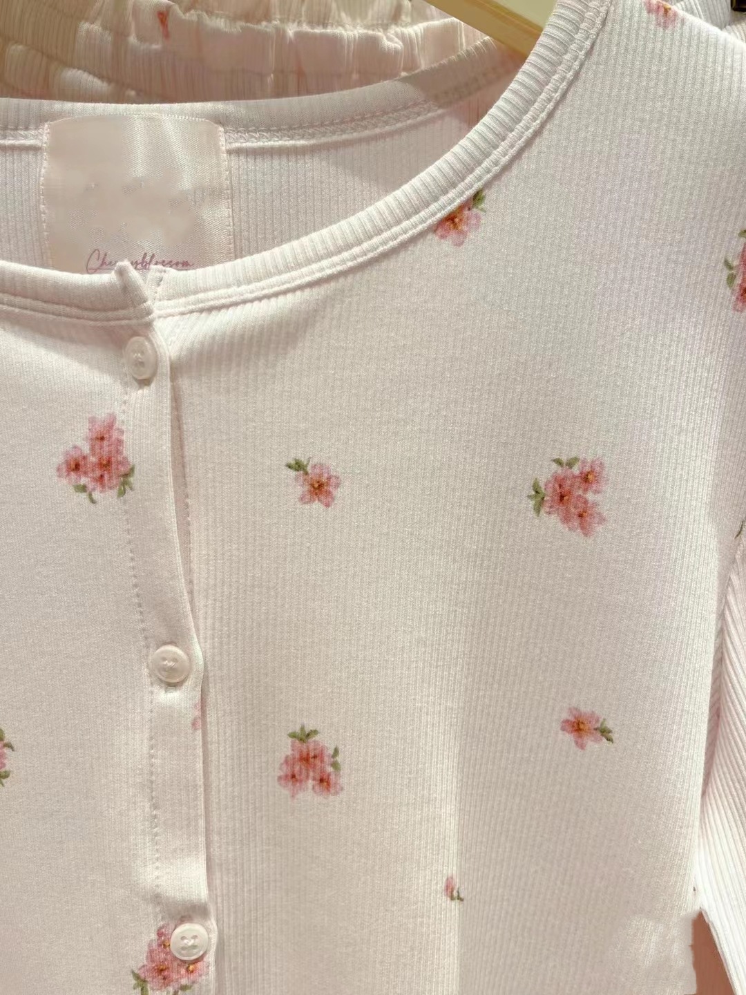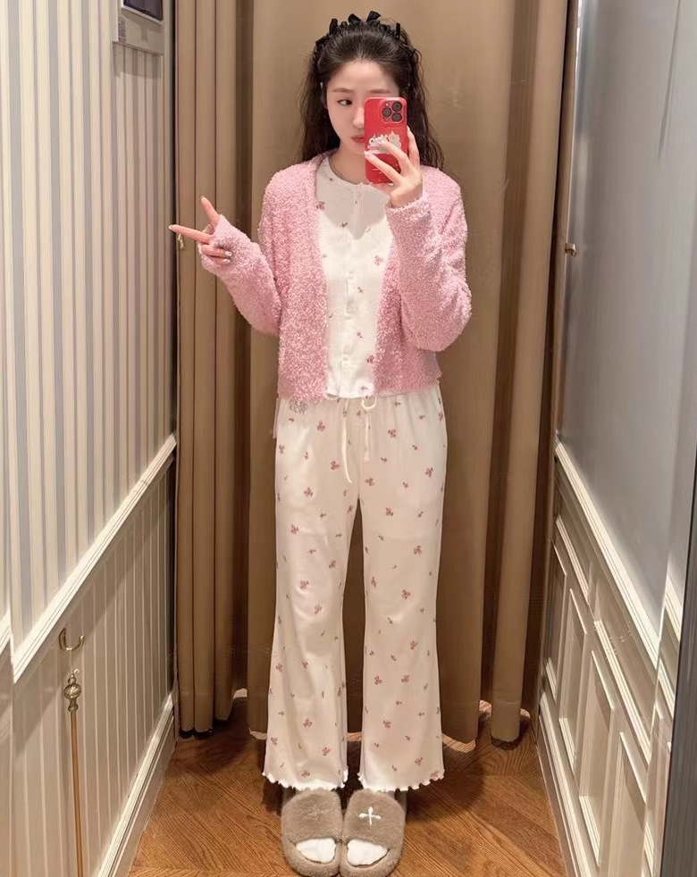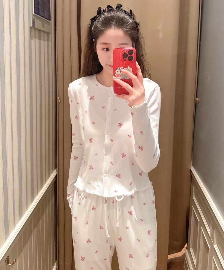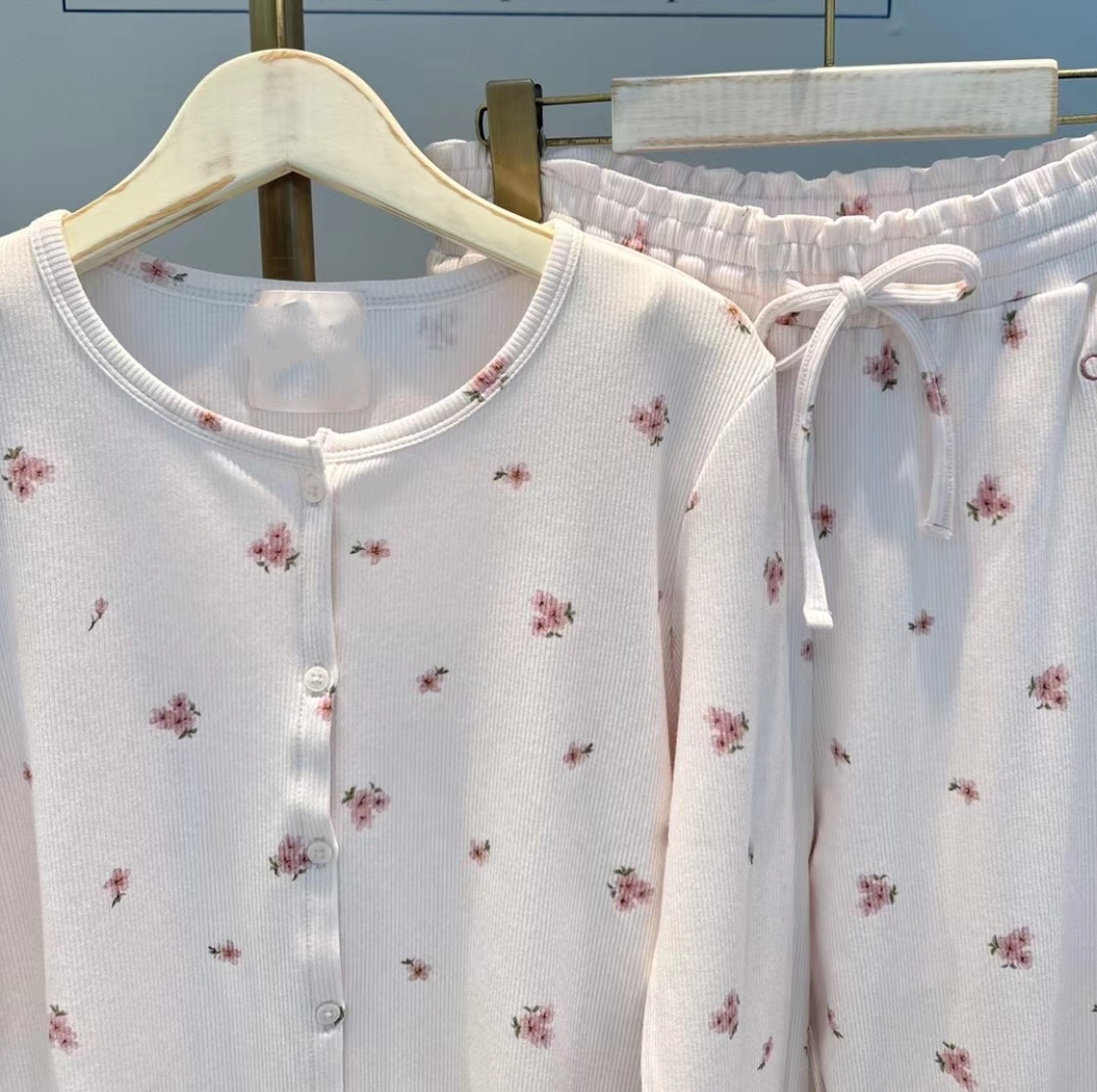 gp 무라벨 오리지널 부드러운 봄면 귀여운 만화 프린트 라운드넥 긴팔 레이스 여성 홈웨어 세트스토어 가기