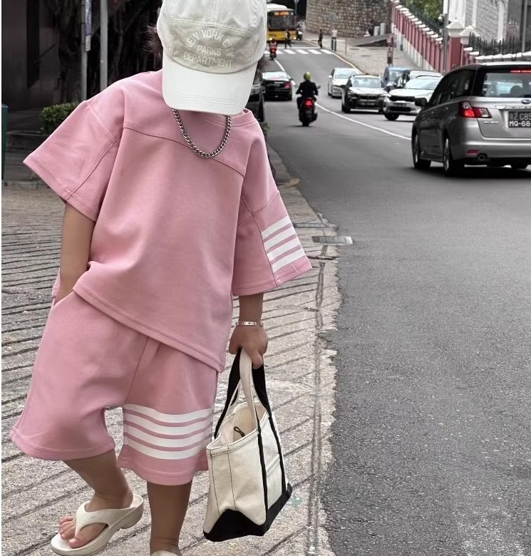 아동 스포츠 정장 2025 여름 새로운 한국 스타일 소년과 소녀를위한 세련된 느슨한 캐주얼 중대형 어린이 투피스 세트 유행스토어 가기