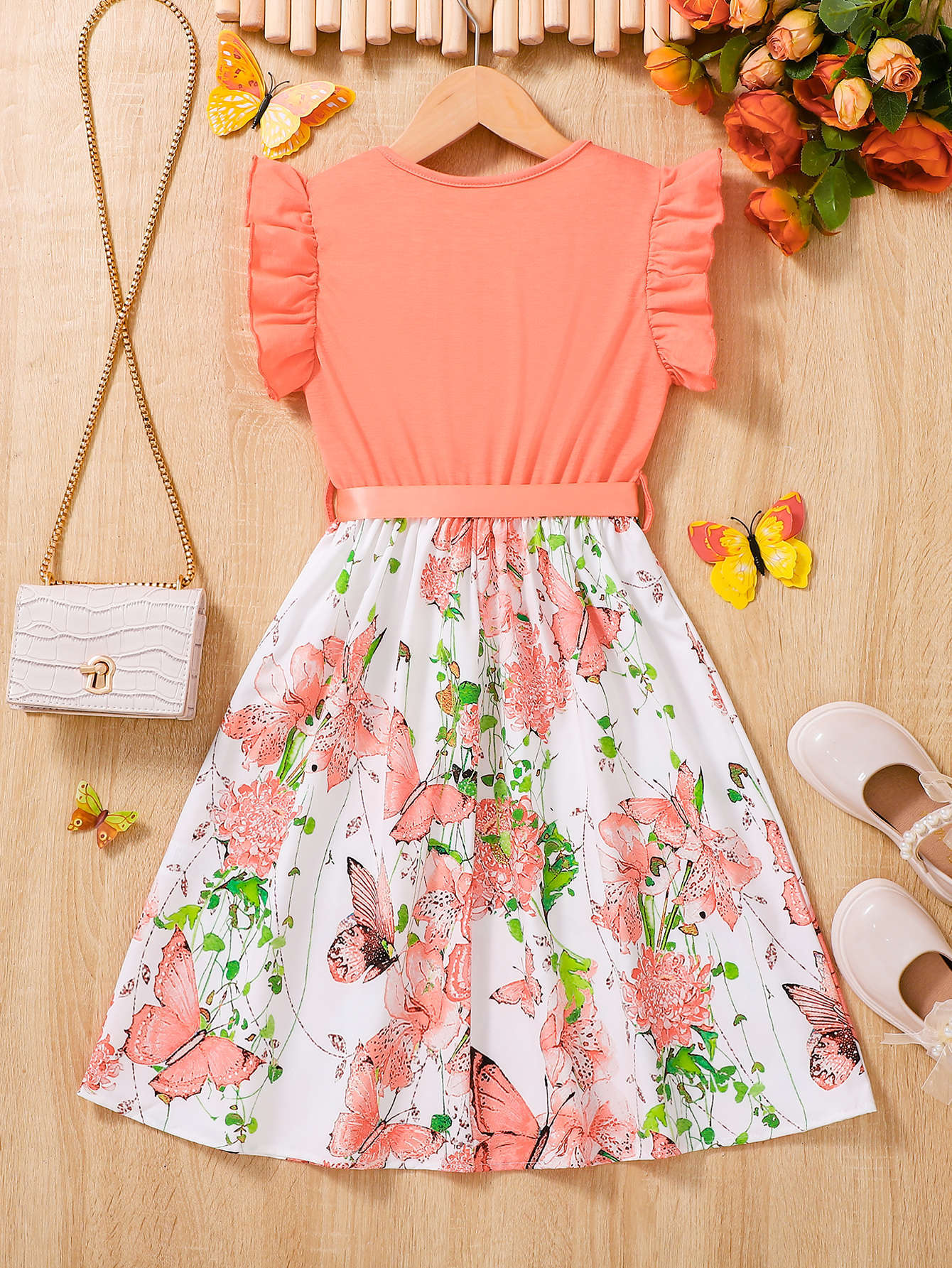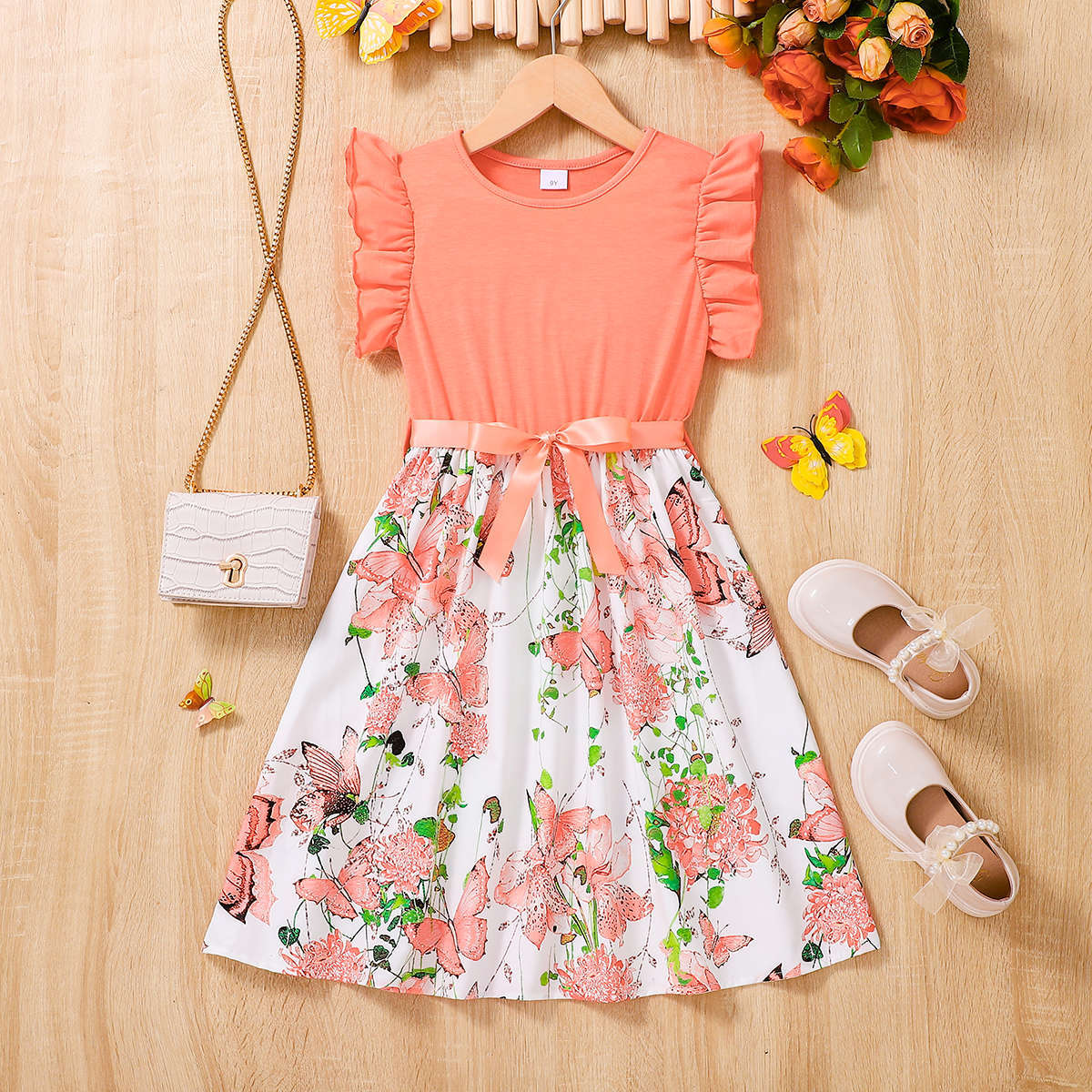 여름 소녀의 새로운 나비 프린트 스플 라이스 솔리드 컬러 민소매 귀 커프스 키즈 드레스 벨트